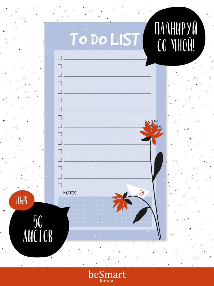 На смену ярким цветочным пятнам пришла обновленная свежая палитра более "припыленных" оттенков в коллекции "Sentiment" от Be Smart. Она будет радовать своими нежными цветами и принтами, мотивирующими фразами и милой понятной графикой. Это ли не ключ к сердечку мечтательной девчонки!Залог успеха - это тайм-менеджмент и грамотное распределение дел. С этим тебе точно поможет наш компактный отрывной планнер "Список дел" размером 100х180 мм. За счёт небольшого размера планнер удобно всегда держать под рукой и носить с собой. Удобное клеевое скрепление позволяет легко удалять листы из планнера.Сам блок на 50 листов - из плотной белой бумаги плотностью 80 г/м2 с цветной печатью с одной стороны и прямыми уголками.Каждый день ты можешь записывать до 16 задач, проставлять отметку об их выполнении и добавлять заметки. Никогда планирование ещё не было таким приятным процессом!