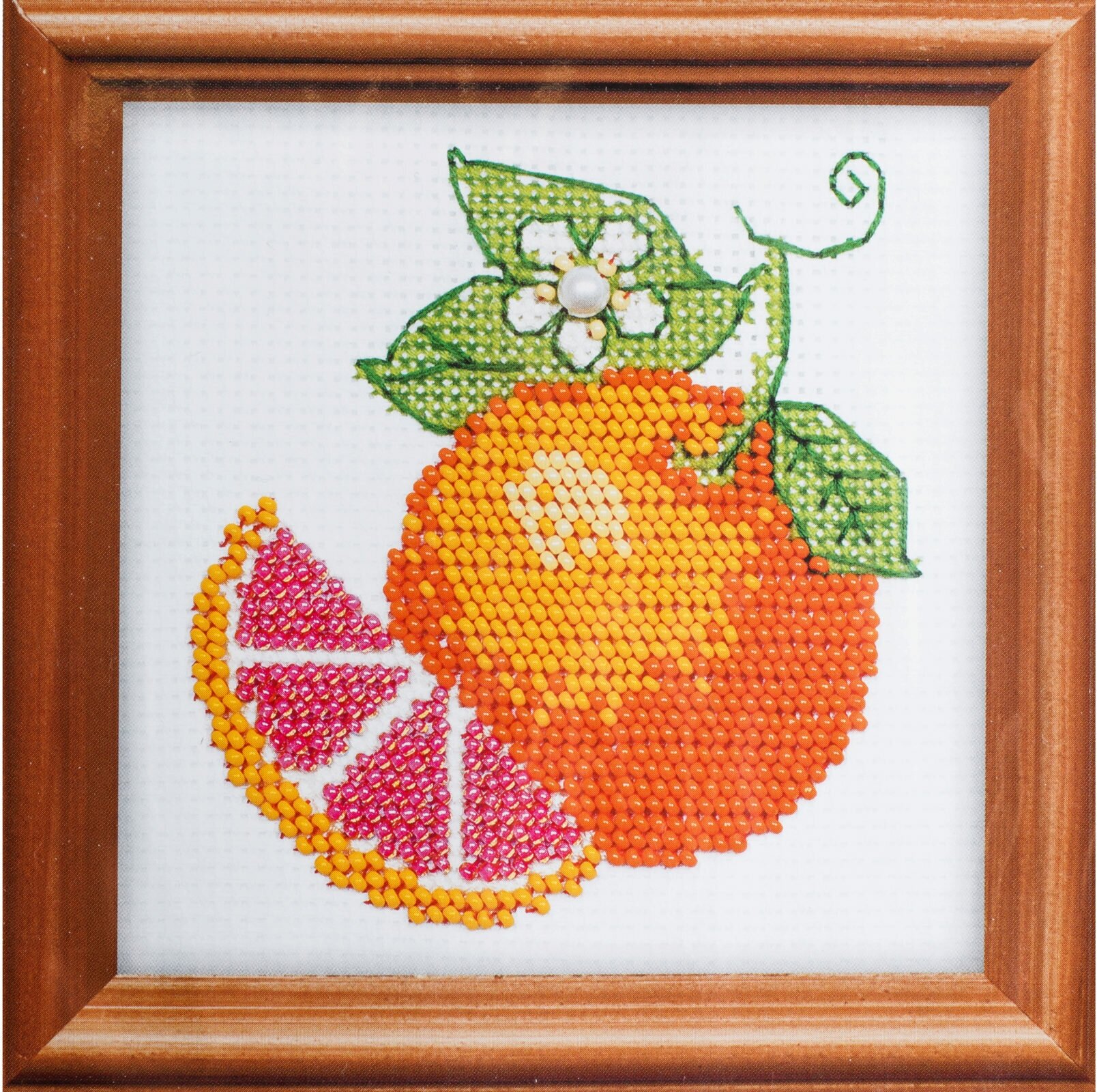 Апельсин' – набор с простым сюжетом и небольшим количеством цветов. Он подходит тем, кто только учится вышивать бисером, делает в этом направлении первые шаги. Основной материал для вышивания – чешский бисер Preciosa, он переливается яркими бликами, долговечен и не выцветает со временем. Отдельные фрагменты вышиваются бусинами и нитками мулине. Готовая вышивка выглядит объемно и притягивает внимание при дневном и искусственном освещении.Рекомендации: – Используйте пяльцы-рамку – так проще выкладывать аккуратные стежки. – Оформите готовую картину в багет со стеклом – он защитит ее от пыли и других воздействий.В наборе: канва Aida 14, бисер, нитки мулине, бусина, иглы (2 вида), цветная схема, инструкция.Количество цветов: нитки – 4, бисер – 4, бусины – 1.Размер: 10х10 см.