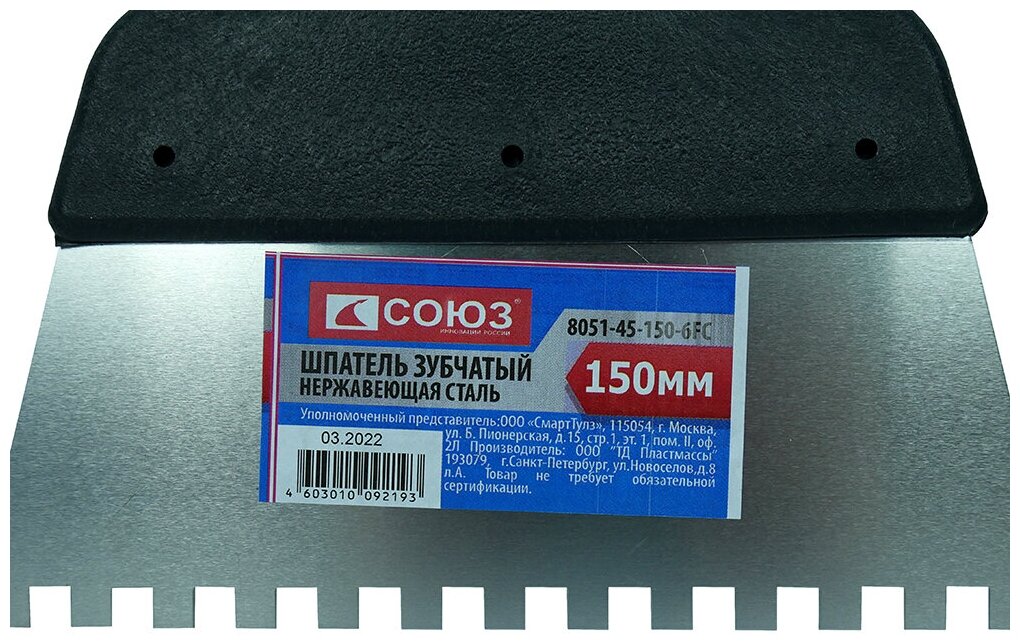 Шпатель СОЮЗ используется для нанесения и равномерного распределения различных густых, клеевых составов, создания фактурной штукатурки. Полотно шпателя изготовлено из стали, которая отлично пружинит и сохраняет это свойство долгое время при эксплуатации. Удобство работ и хранение - обеспечивает эргономичная пластиковая ручка комфортная при удержании и ведении шпателя. Для удобства хранения у пластиковой ручки имеется отверстие для подвеса..