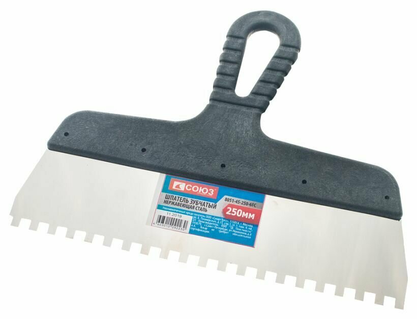 Шпатель СОЮЗ 250 мм представляет собой надежный ручной инструмент. Лезвие выполнено из нержавеющей стали и оснащено зубцами. Шпатель применяется при проведении штукатурных и отделочных работ.