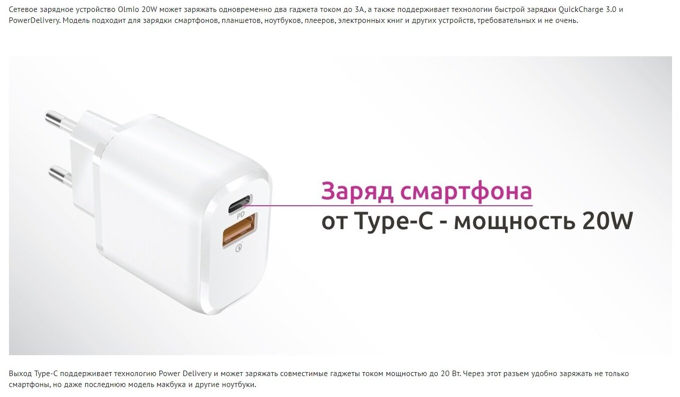 Сервис сравнения цен СкидкаГИД предлагает сравнить цены на товар «Сетевое зарядное устройство Olmio 043365 Type-C +USB PowerDelivery QuickCharge 20W белый»