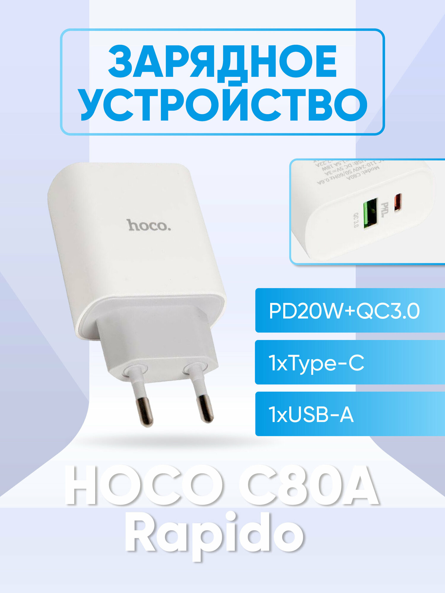 Сетевое зарядное устройство Hoco C80A Rapido USB+Type-C PD20W+QC3.0 белый (40519) (УТ000024209)