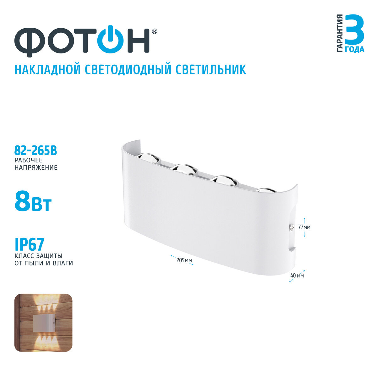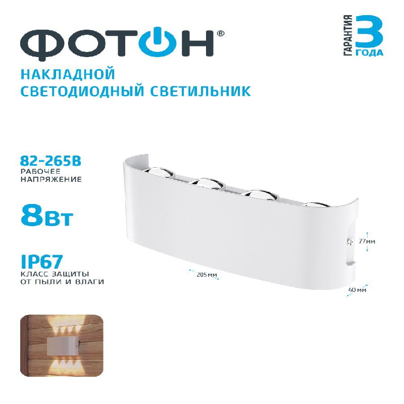 Накладные светодиодные светильники фотон относятся к продуктовой категории "архитектурная подсветка" и предназначены для декоративного освещения домов, дач и других строений, в том числе в условиях нестабильного напряжения электросети. Обеспечивают стабильно ровный световой поток в диапазоне напряжений от 82 В до 265 В. Могут использоваться в самых неблагоприятных погодных условиях, в том числе при снеге и дожде любой интенсивности. Технология термореактивной порошковой покраски обеспечивает устойчивость к истиранию, механическому и электрическому воздействию, УФ-излучению, перепадам температуры. На все светильники фотон распространяется безусловная гарантия 3 года с даты производства или покупки.