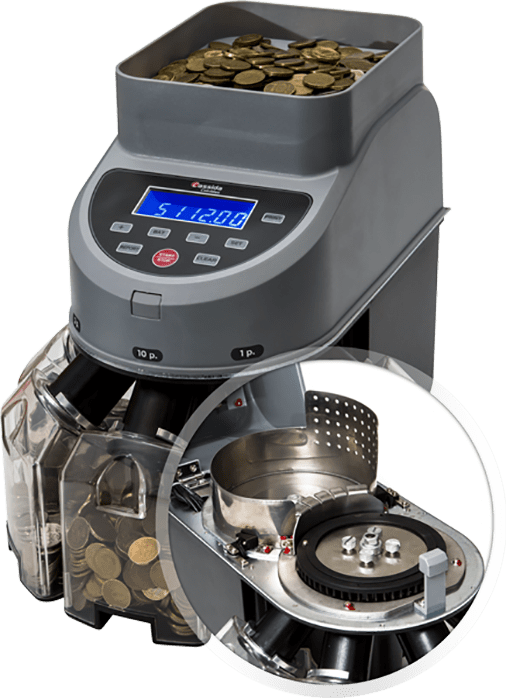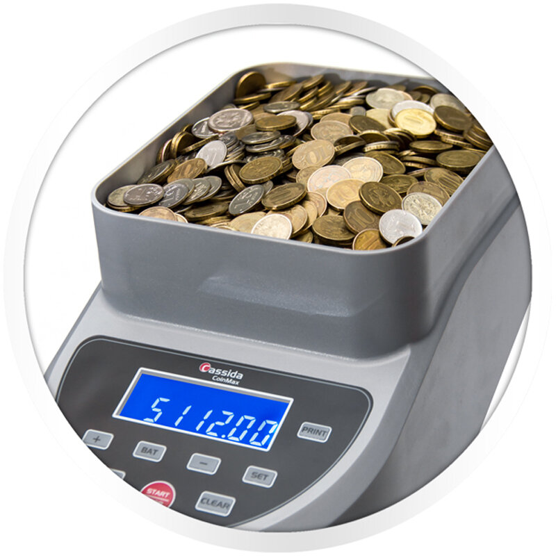 Сортировщик монет Cassida CoinMax предназначен для пересчёта монет крупных номиналов на высокой скорости. Его сортировочный механизм выполнен из легированной стали и рассчитан на длительный срок службы. Высокая скорость работы и точность подсчёта делают его удобным в использовании на АЗС, АЗК, в транспортных и вендинговых компаниях.