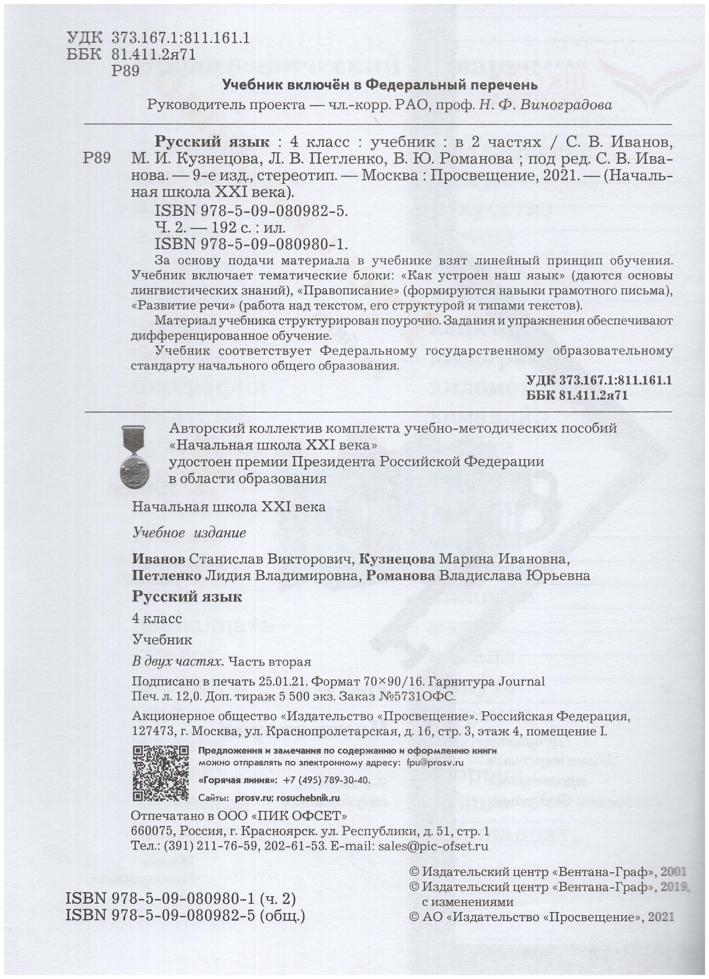 Сервис сравнения цен СкидкаГИД предлагает сравнить цены на товар «Книга: Русский язык 4 класс Учебник В двух частях Часть вторая (Лидия Владимировна Петленко, Станислав Викторович Иванов, Марина Ивановна Кузнецова); Вентана-Граф/Просвещение, 2025»