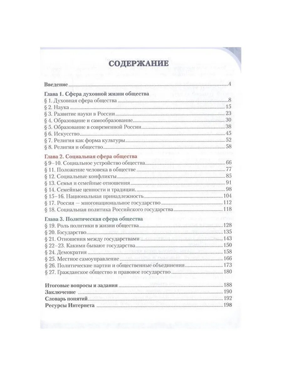 Учебник знакомит обучающихся с особенностями развития духовной, социальной и политической сфер жизни общества в их взаимосвязи друг с другом. Обучающиеся узнают о влиянии ценностей духовной культуры на формирование личности. Учебник расскажет, как возникла современная наука и как изменилась её роль в современной жизни, какое значение имеют искусство и религия в жизни человека и общества. Работая с учебником, школьники получат важные сведения о социальных и политических отношениях, которые помогут им ориентироваться в жизни, осознать своё место и роль в социальной группе. Они узнают, что такое социальный статус, какую роль играет образование в повышении социального статуса, в чём заключаются важнейшие семейные ценности. Обучающиеся получат информацию о государстве и его функциях, об особенностях нашего многонационального и многоконфессионального государства, о том, что такое политические партии, и какова их роль в жизни общества, о деятельности гражданского общества и его влиянии на принятие политических решений. Учебник состоит из глав и параграфов. В начале каждого параграфа помещены мотивационные вопросы, ответить на которые можно учащиеся смогут после изучения содержащегося в нём материала. Параграфы разделены на части подзаголовками. Они формулируют основные положения рассматриваемой темы. Для лучшего усвоения содержания параграфа в нём предусмотрены важные рубрики. Так, рубрика «Следует запомнить» окажется полезной для работы с основными понятиями курса «Обществознание». Приведённые в учебнике примеры и пояснения помогут не только уяснить сложные понятия, но и свободно использовать их в обычной жизни. Есть рубрика «Это интересно», поясняющая и расширяющая основной текст параграфа фактами истории и современности, а также результатами научных исследований. Рубрики «Мысли великих людей» и «Говорят наши современники» знакомят с высказываниями выдающихся людей прошлого и настоящего. Рубрика «Изучаем законодательство» раскрывает основные положения нормативных документов. Параграфы учебника включают разнообразные вопросы и задания: внутри основного текста; после каждой части параграфа; к рубрикам, иллюстрациям и схемам. Система вопросов и заданий в конце параграфа нацелена на использование полученных знаний, осмысление рассмотренных в параграфе проблем. Вопросы и задания повышенной сложности отмечены звёздочкой (*). В конце учебника помещены итоговые вопросы и задания. Учебник соответствует ФГОС ООО и Примерной основной образовательной программе основного общего образования (2015)