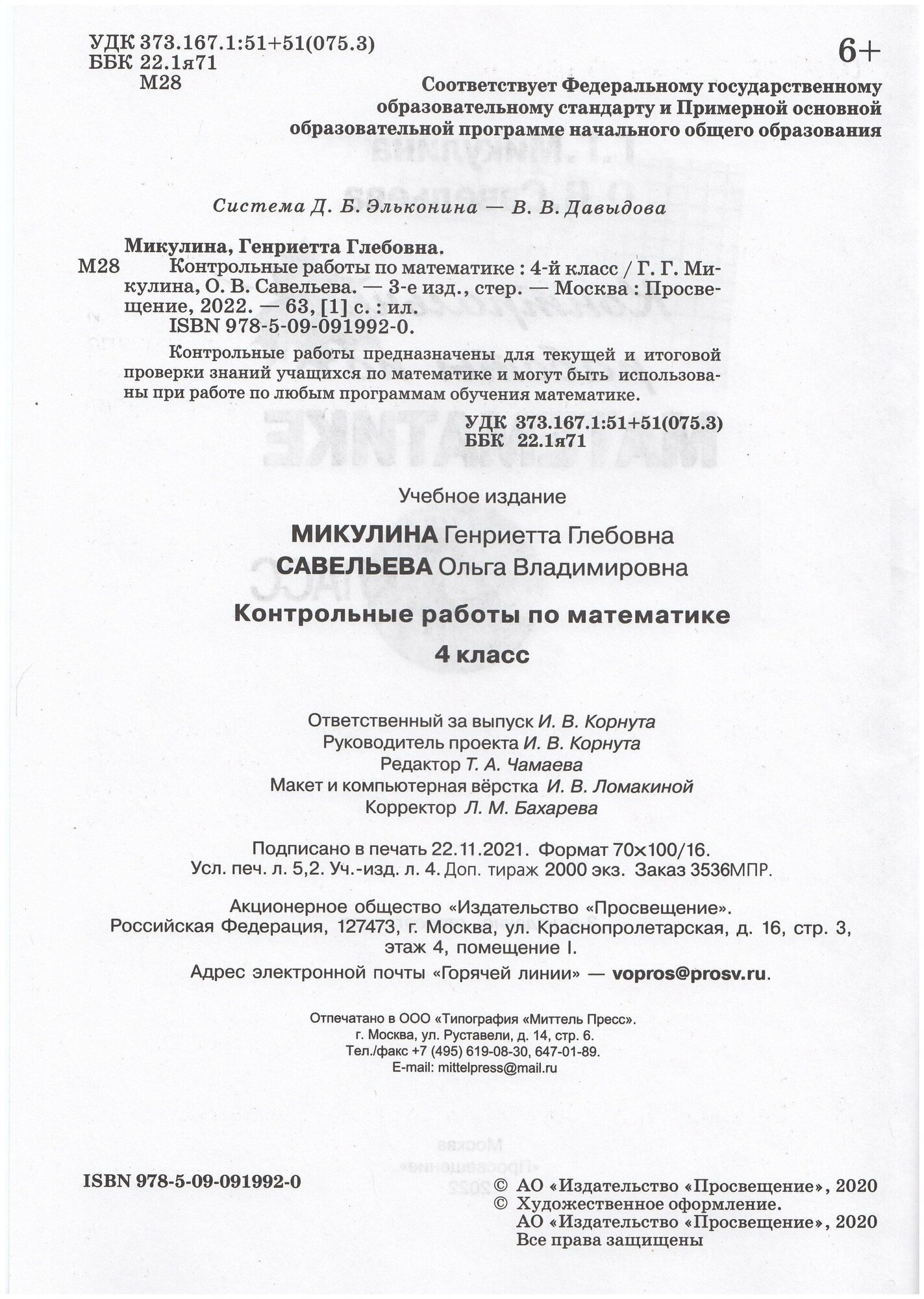 Сервис сравнения цен СкидкаГИД предлагает сравнить цены на товар «Книга: Контрольные работы по математике 4 класс Система Д Б Эльконина - В В Давыдова (Ольга Владимировна Савельева, Генриетта Глебовна Микулина); Просвещение, 2024»