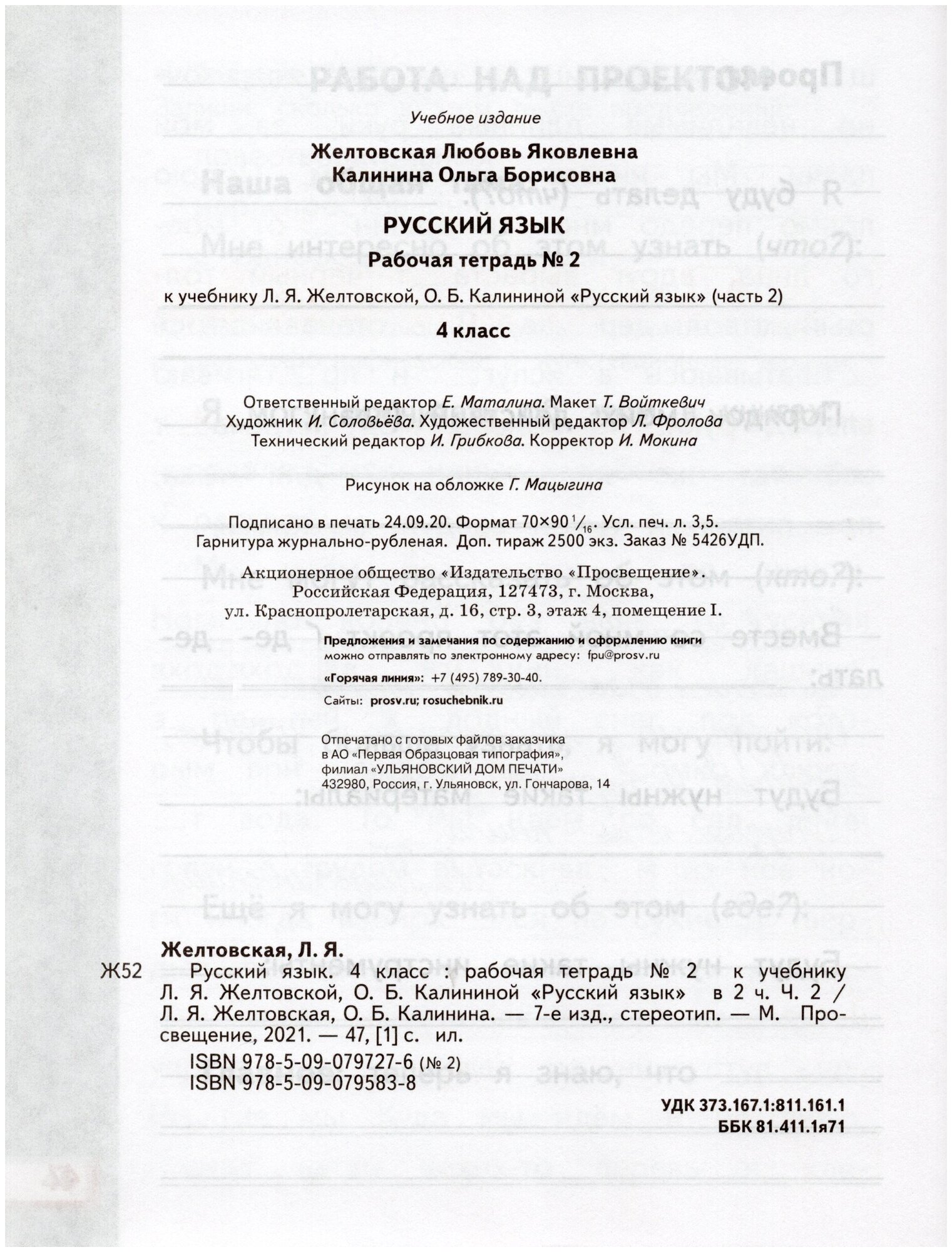 Русский язык 4 класс Рабочая тетрадь 2 к учебнику Л Я Желтовской О Б Калининой Русский язык часть 2 (Желтовская Любовь Яковлевна, Калинина Ольга Борисовна); Дрофа/Просвещение, 2021