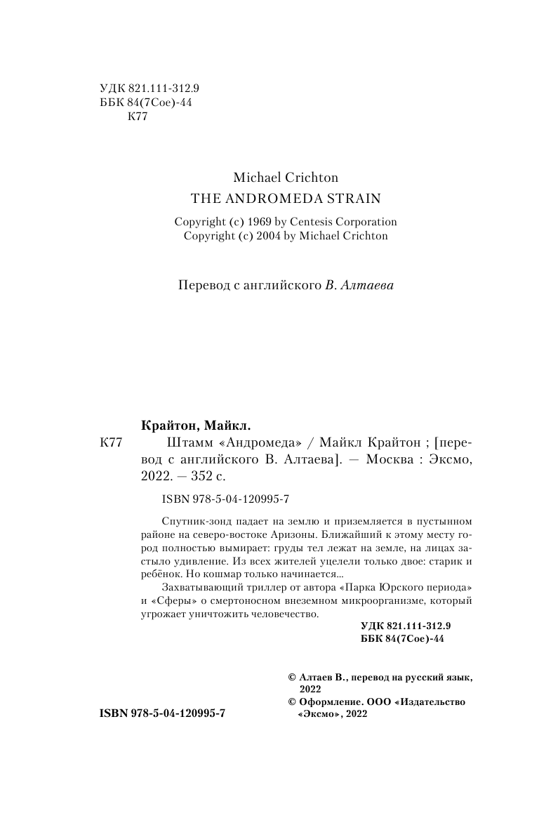 Книга: Штамм «Андромеда» (Крайтон Майкл); ООО "Издательство "Эксмо", 2022