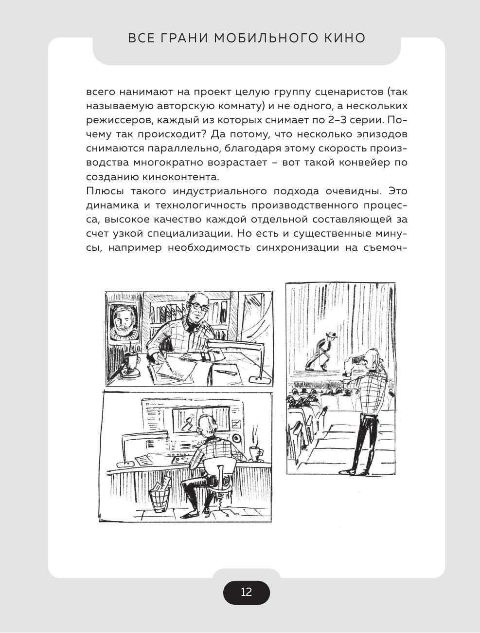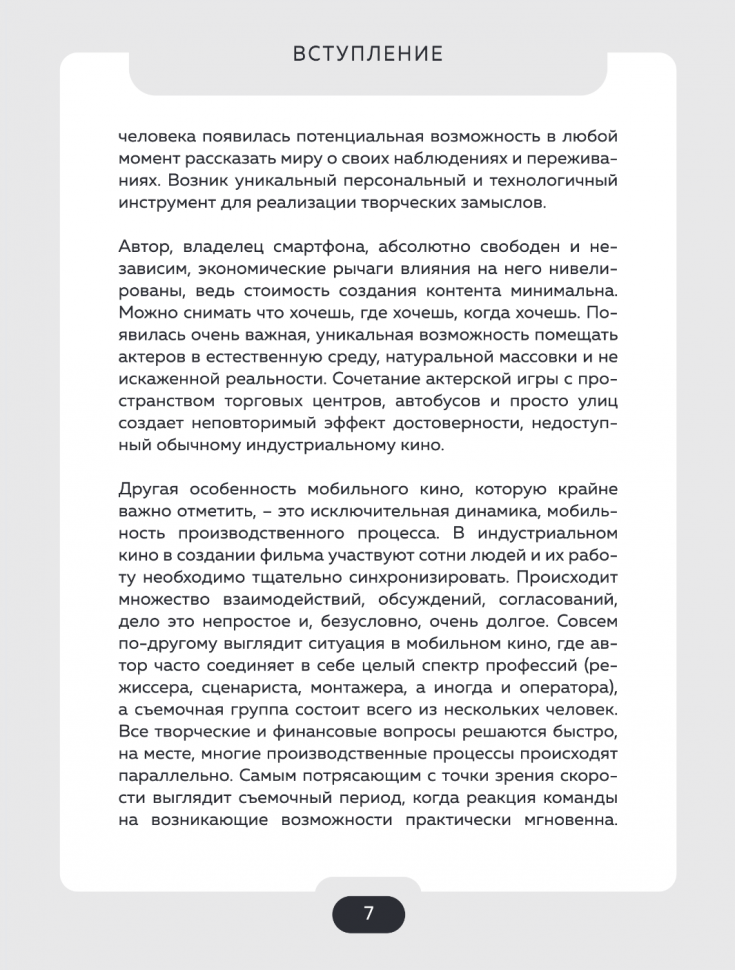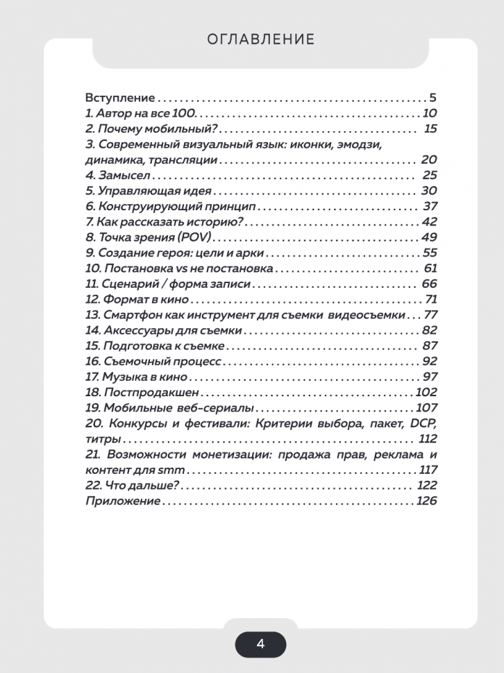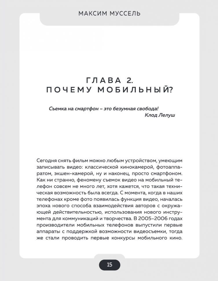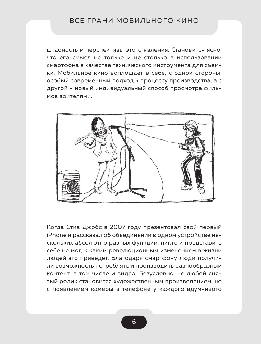 Книжка в твёрдой обложке, но очень тоненькая, шрифт средне-крупный, есть иллюстрации-зарисовки. В книге описывается с чего всё началось и как вам присоединиться к этому кино-мобильному искусству. Эта книга поможет вам правильно рассказать задуманную вами историю, создать главного героя, поможет выбрать полезные аксессуары для съёмки, и многое другое. И нет, тут вы не найдёте чёткой схемы как и что снимать, на каких настройках и всего такого.