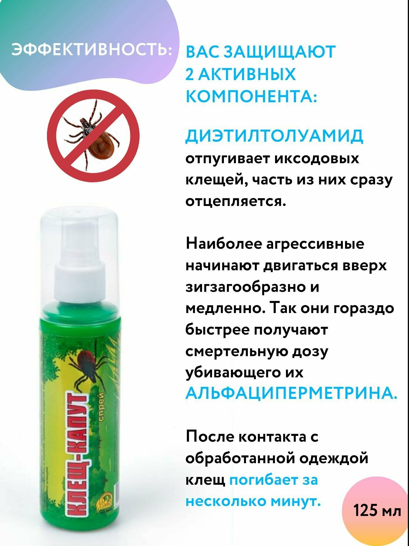 Эффективное отпугивание: Средство Клещ-капут быстро и эффективно отпугивает всех видов клещей.