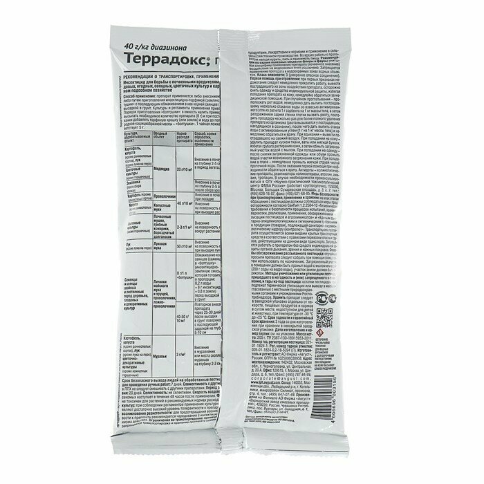 Используется Террадокс различными способами, в зависимости от культуры. При посадке картофеля, капустной рассады, лука, цветочных культур гранулы препарата вносят в почву или на ее поверхность. При пересадке саженцев обмакивают корни в приготовленную инсектицидно-земляную болтушку. Террадокс обладает длительной защитой, высокой скоростью воздействия и нетоксичен для культур в рекомендуемых нормах. Эффективность препарата отмечена против большинства почвенных насекомых: медведки, капустных мух, почвенных мушек, грибных комариков, бороздчатого долгоносика, луковой мухи, проволочников, ложнопроволочников, личинок майского жука, хрущей и др. Даже если Вам не удается определить, кто именно портит урожай, применив Террадокс, можно быть спокойным: он без проблем справится с незваными гостями на Вашем приусадебном участке.
