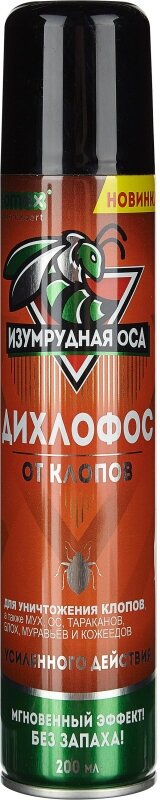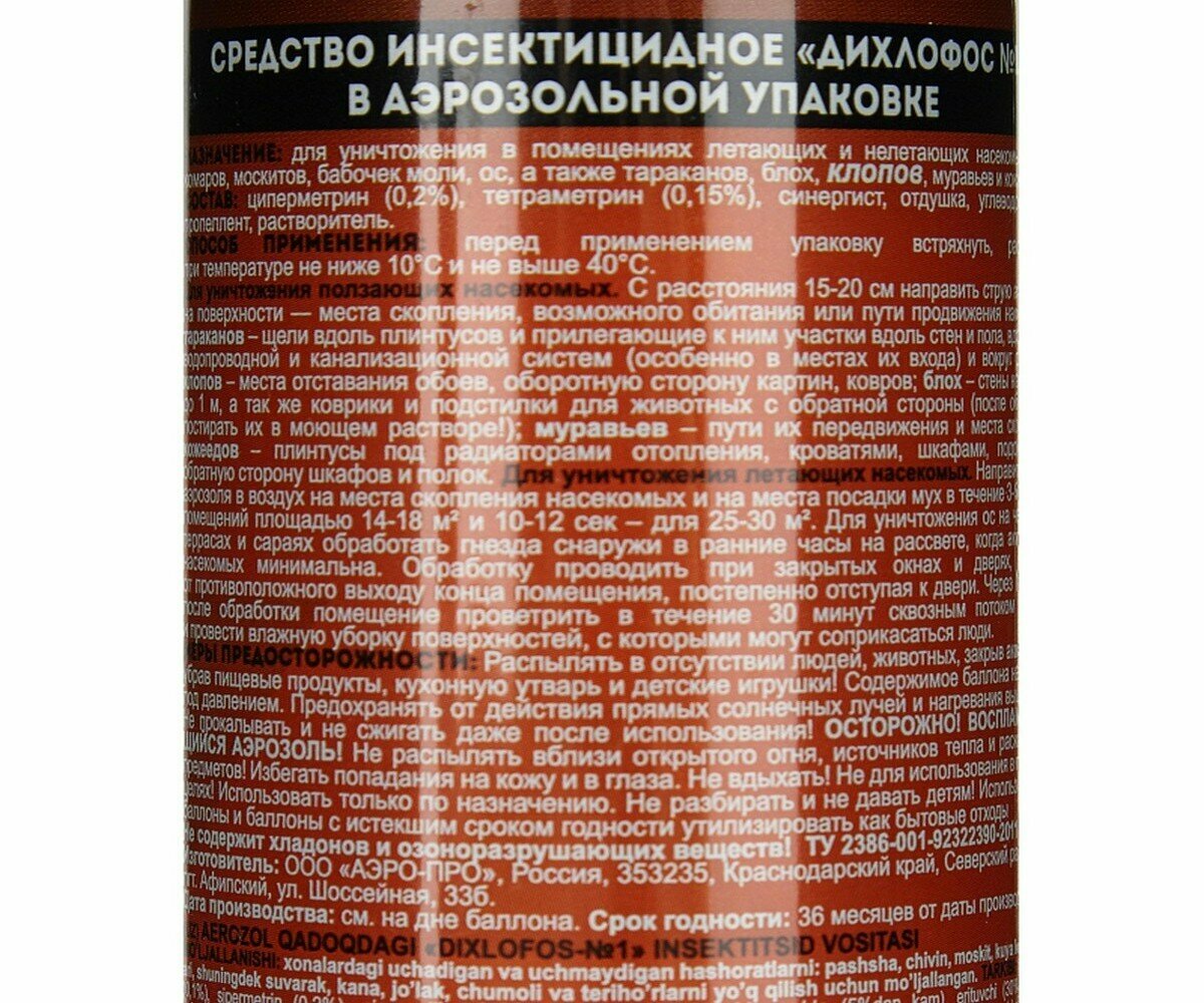 Для уничтожения в помещениях летающих и нелетающих насекомых: мух, комаров, москитов, бабочек моли, ос, а также тараканов, блох, клопов, муравьев и короедов.Способ применения. Перед применением упаковку встряхнуть, распылять при температуре не ниже 10°С и не выше 40°С. Для уничтожения ползающих насекомых: С расстояния 15-20 см направить струю аэрозоля на поверхности — места скопления, возможного обитания или пути продвижения насекомых: тараканов – щели вдоль плинтусов и прилегающие к ним участки вдоль стен и пола, вдоль труб водопроводной и канализационной систем (особенно в местах их входа) и вокруг раковин; клопов – места отставания обоев, оборотную сторону картин, ковров; блох – стены на высоту до 1 м, а так же коврики и подстилки для животных с обратной стороны (после обработки постирать их в моющем растворе!); муравьев – пути их передвижения и места скопления; кожеедов – плинтусы под радиаторами отопления, кроватями, шкафами, подоконники, обратную сторону шкафов и полок. Для уничтожения летающих насекомых: Направить струю аэрозоля в воздух на места скопления насекомых и на места посадки мух в течение 3-5 сек для помещений площадью 14-18 м2 и 10-12 сек – для 25-30м2. Для уничтожения ос на чердаках, террасах и сараях обработать гнезда снаружи в ранние часы на рассвете, когда активность насекомых минимальна. Обработку проводить при закрытых окнах и дверях, начиная от противоположного выходу конца помещения, постепенно отступая к двери. Через 15 минут после обработки помещение проветрить в течение 30 минут сквозным потоком воздуха и провести влажную уборку поверхностей, с которыми могут соприкасаться люди.меры предосторожности: огнеопасно. Воспламеняющийся аэрозоль! Не распылять вблизи открытого огня и раскаленных предметов! Содержимое баллона находится под давлением! Предохранять от прямых солнечных лучей и нагревания выше +40°С. Не допускать попадания в глаза! При попадании в глаза немедленно промыть их большим количеством воды. Хранить отдельно от пищевых продуктов в сухом, прохладном, недоступном для детей месте. Беречь от детей!