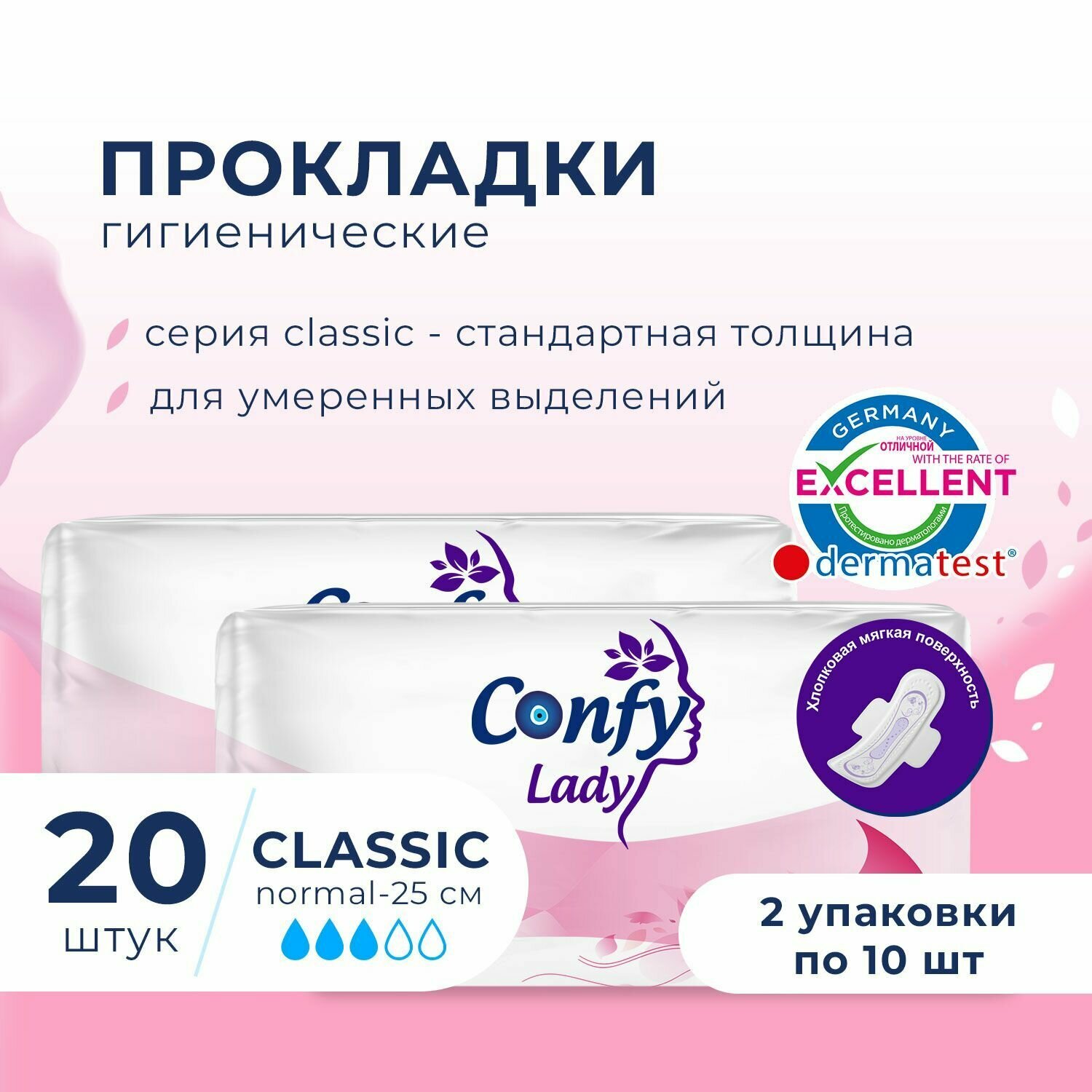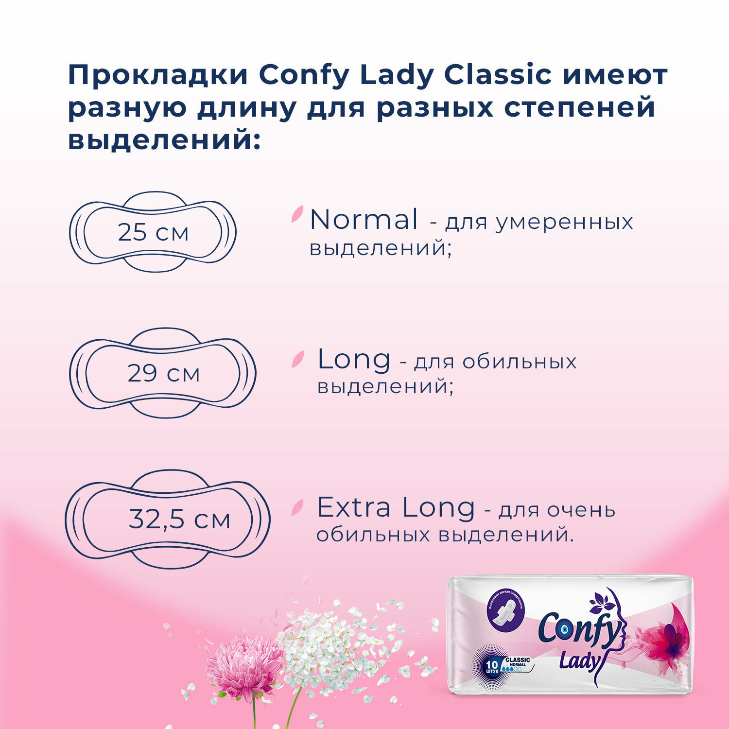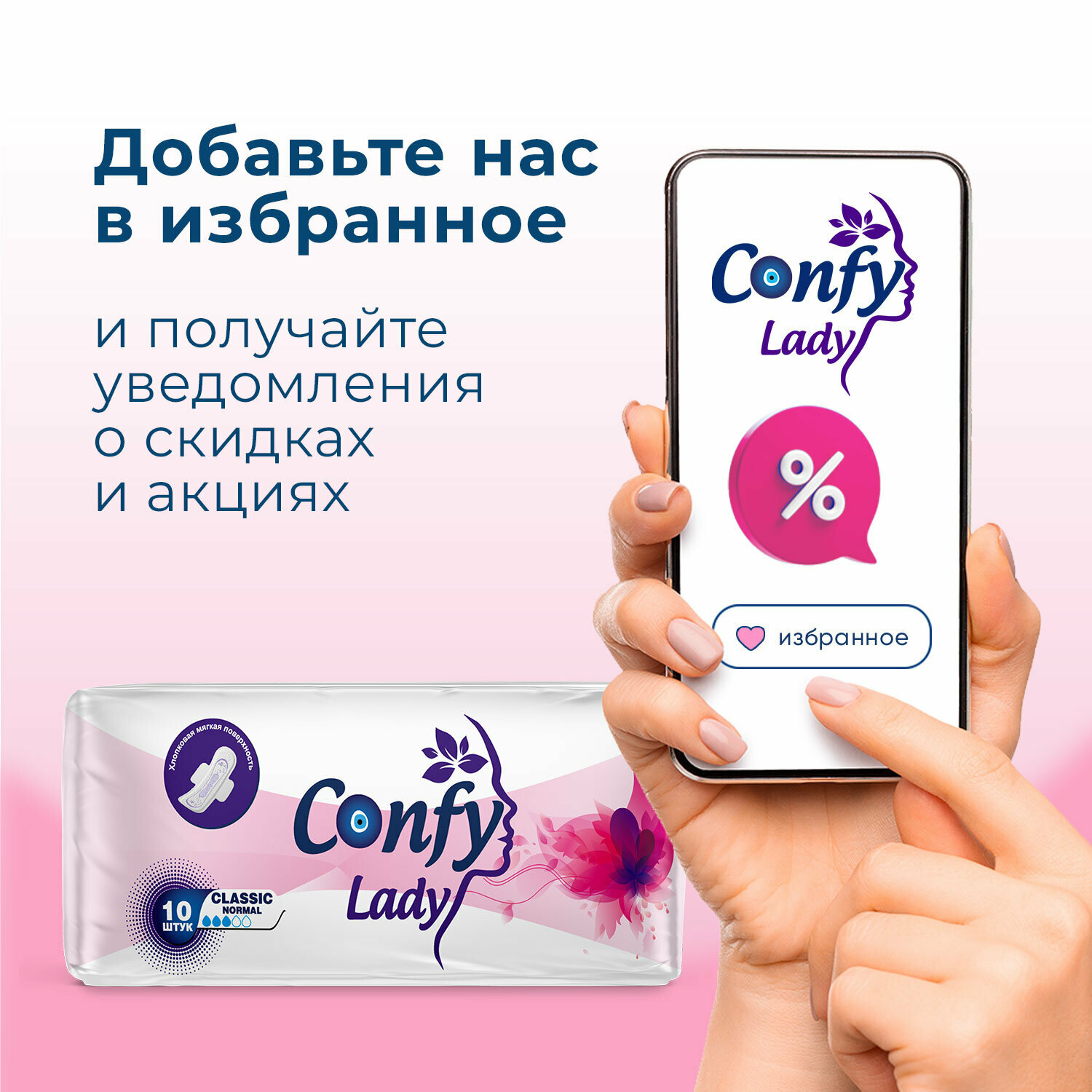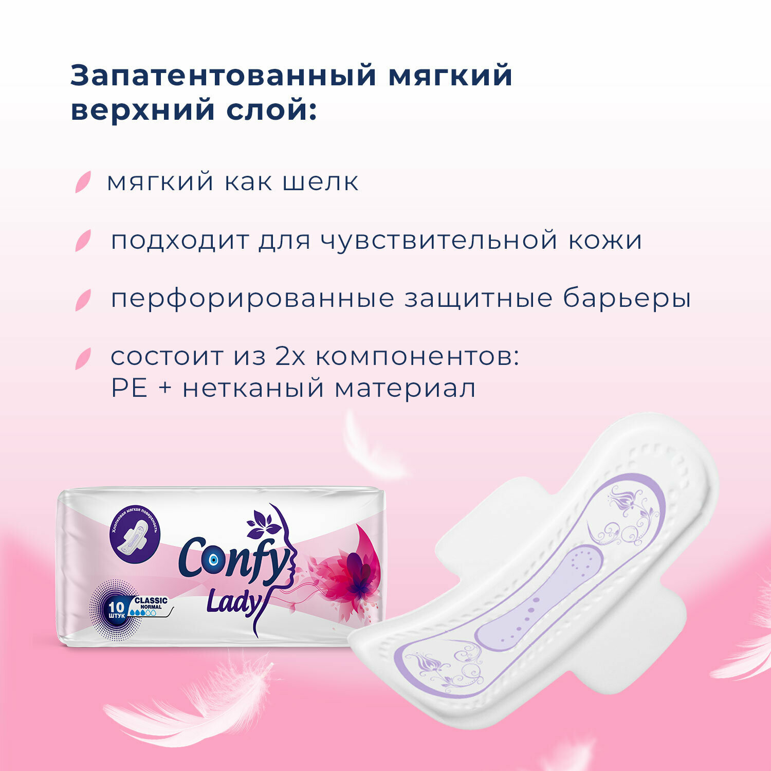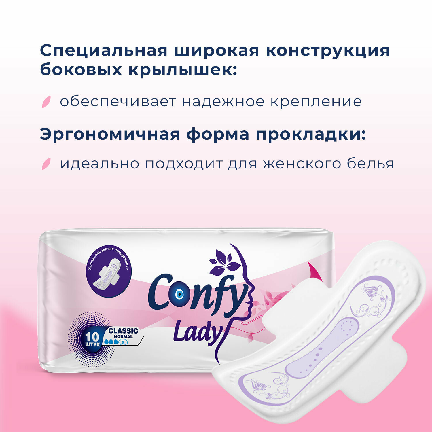 | Полное наименование | Прокладки женские гигиенические Confy Lady Classic Normal с крылышками 10 шт |