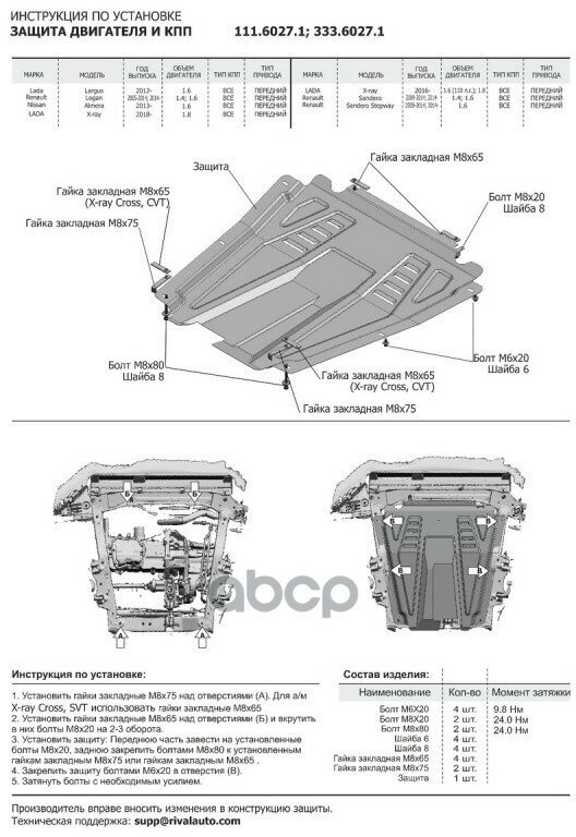 Защита картера и КПП Rival для LADA Largus 2012Nissan Almera 2013Renault Logan 2005-2014 2014Renault Sandero 2007-2014 2014-, алюминий 3 мм., комплект крепежа, .