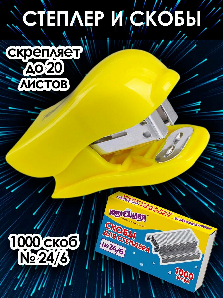 Настольный степлер юнландия " Дельфин" с металлическим механизмом незаменим в работе с документами. Полезный аксессуар для школы и дома. Для скрепления до 20 листов бумаги. В комплекте со степлером поставляются скобы №24/6 в количестве 1000 штук. Глубина закладки бумаги - 22 мм. Закрытый и прямой виды сшивания. Оснащен антистеплером. За счет компактных размеров не займет на парте или столе много места, а яркий желтый или голубой цвет и напоминающая дельфина форма скрасят время ребенка на уроках или при написании домашней работы. Степлер юнландия высокого качества надолго станет незаменимым помощником при написании творческих работ.