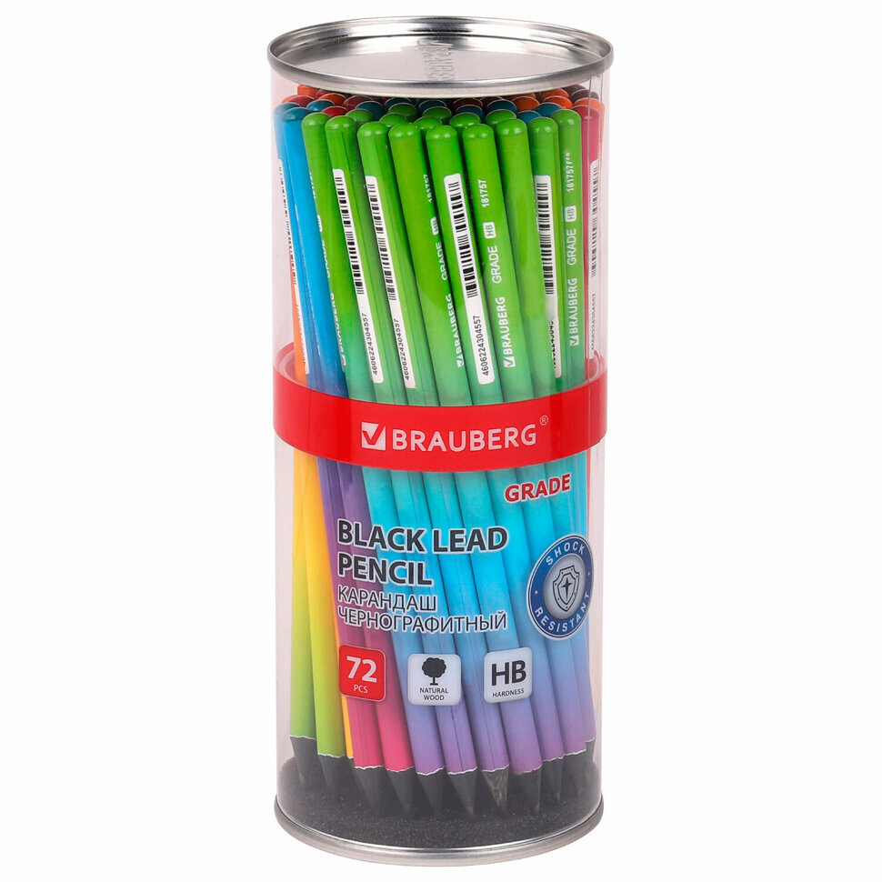 Карандаш чернографитный BRAUBERG "GRADE" - первый помощник для выполнения различных заметок. Позволяет сделать легкий набросок, быстрый стремительный рисунок или нарисовать полноценную картину. Используется повсеместно. Каждый карандаш имеет индивидуальный штрих-код. Легко затачивается, максимально устойчив к повреждениям. Изготовлен из черного дерева высокого качества. Имеет круглое сечение. Карандаш длиной 172 мм обладает средней степенью твердости - HB. Корпус покрыт цветной печатью ассорти в 5 дизайнах. Поставляется заточенным в пластиковой тубе по 72 штуки.