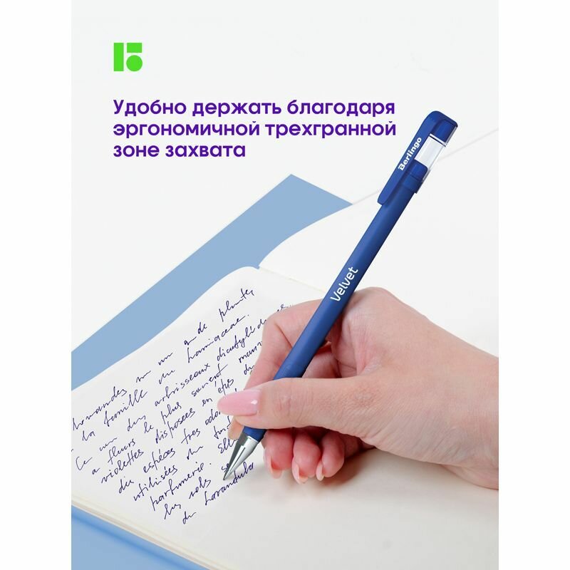 Ручка гелевая Berlingo Velvet с колпачком и клипом станет стильным канцелярским аксессуаром и надежным помощником для работы или учебы. Благодаря технологии Soft touch, приятное на ощупь бархатистое покрытие корпуса создает дополнительный комфорт при письме. Цвет корпуса соответствует цвету чернил. Эргономичная трёхгранная зона захвата обеспечивает удобство при работе при использовании ручки. Рифление в зоне захвата препятствует скольжению пальцев. Цвет чернил синий. Диаметр пишущего узла составляет 0,5 мм, благодаря чему получается тонкая, аккуратная линия. Толщина линии письма 0,4 мм, а длина линии письма 400 м.