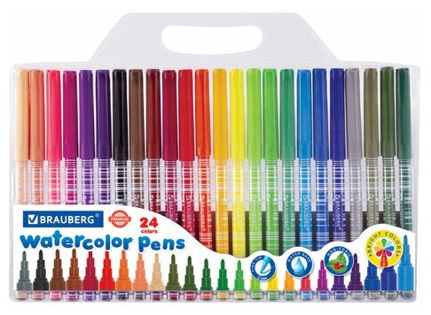 Набор фломастеров Brauberg Premium с насыщенными, яркими цветами в количестве 24 штук. Чернила на водной основе практически не имеют запаха, не токсичны и легко смываются с большинства материалов и тканей.