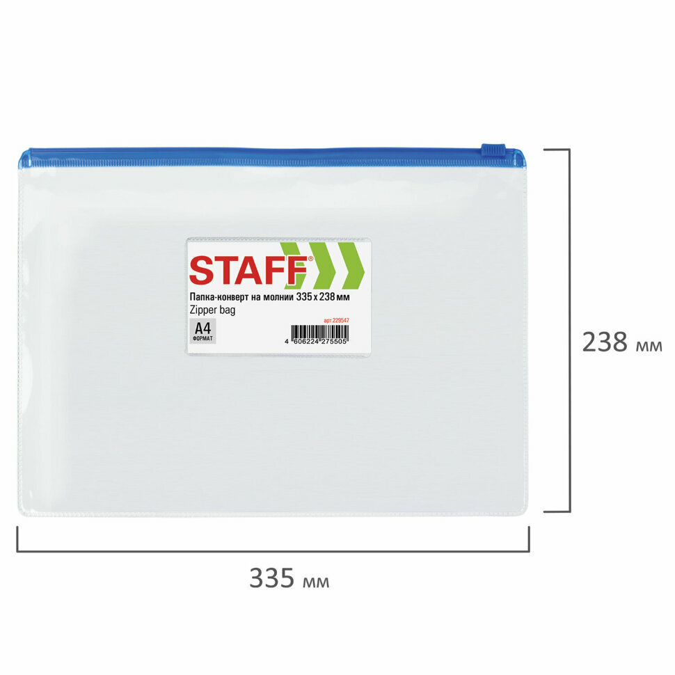Папка-конверт на молнии ''Staff'' подойдет для хранения и транспортировки важных документов. Изготовлена из прочного прозрачного пластика толщиной 0,12 мм с гладкой фактурой. Формат А4 (335х238 мм). Герметичная застежка-зиплок защищает документы от механических повреждений, а также пыли и влаги. Имеется карман для визитки. Цвет молнии - ассорти (поставляется без возможности выбора).