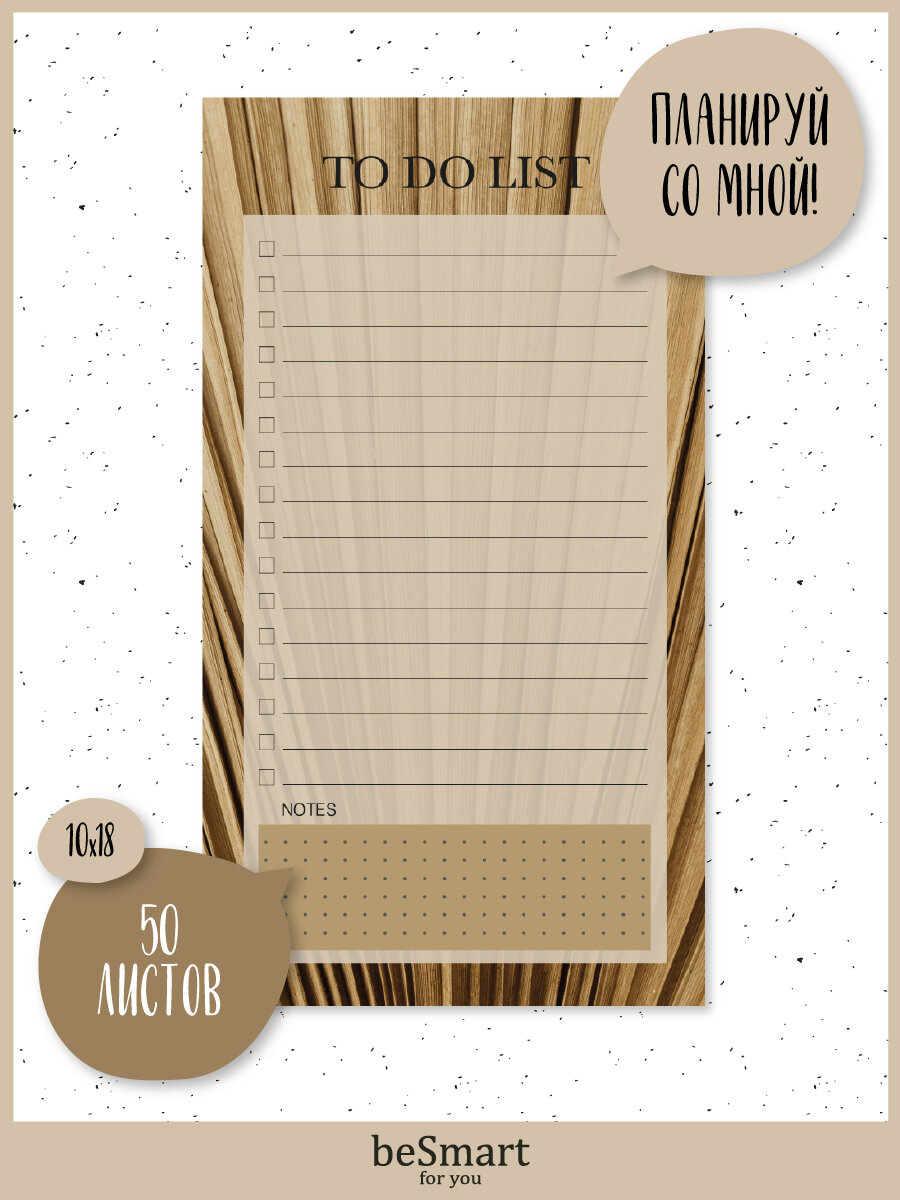 Коллекция "Nude" от Be Smart - про чувства, про глубину мысли, про сдержанность и минималистичность. Про то, что заставляет людей остановить свой взгляд и погрузиться в созерцание, почувствовать цвет, настроение и запахи. Залог успеха - это тайм-менеджмент и грамотное распределение дел. С этим тебе точно поможет наш компактный отрывной планнер "Список дел" размером 100х180 мм. За счёт небольшого размера планнер удобно всегда держать под рукой и носить с собой. Удобное клеевое скрепление позволяет легко удалять листы из планнера.Сам блок на 50 листов - из плотной белой бумаги плотностью 80 г/м2 с цветной печатью с одной стороны и прямыми уголками.Каждый день ты можешь записывать до 16 задач, проставлять отметку об их выполнении и добавлять заметки. Никогда планирование ещё не было таким приятным процессом!