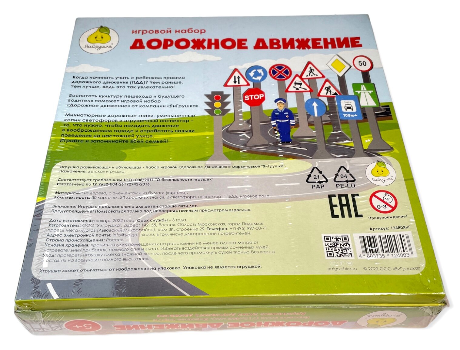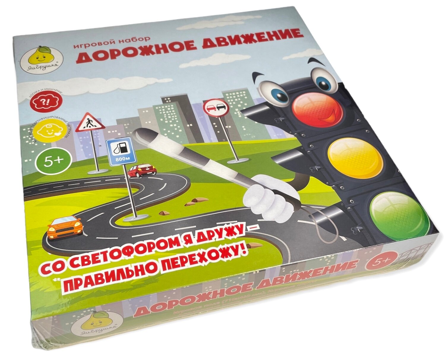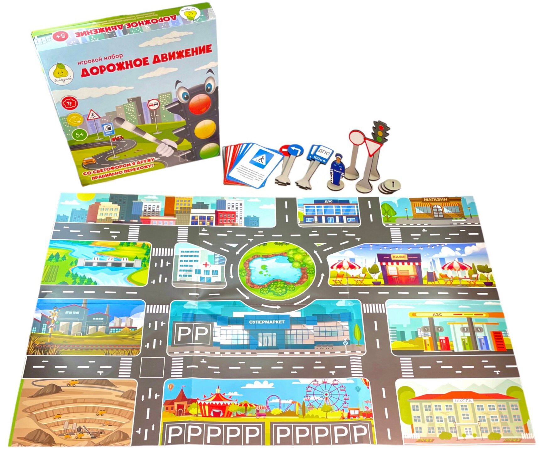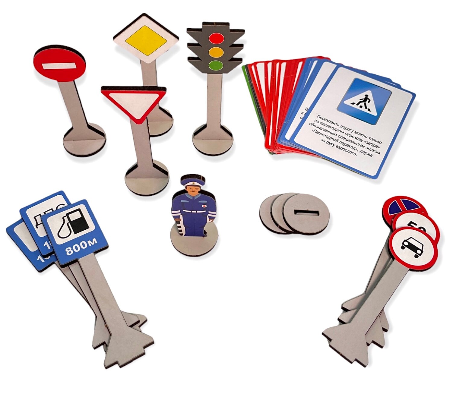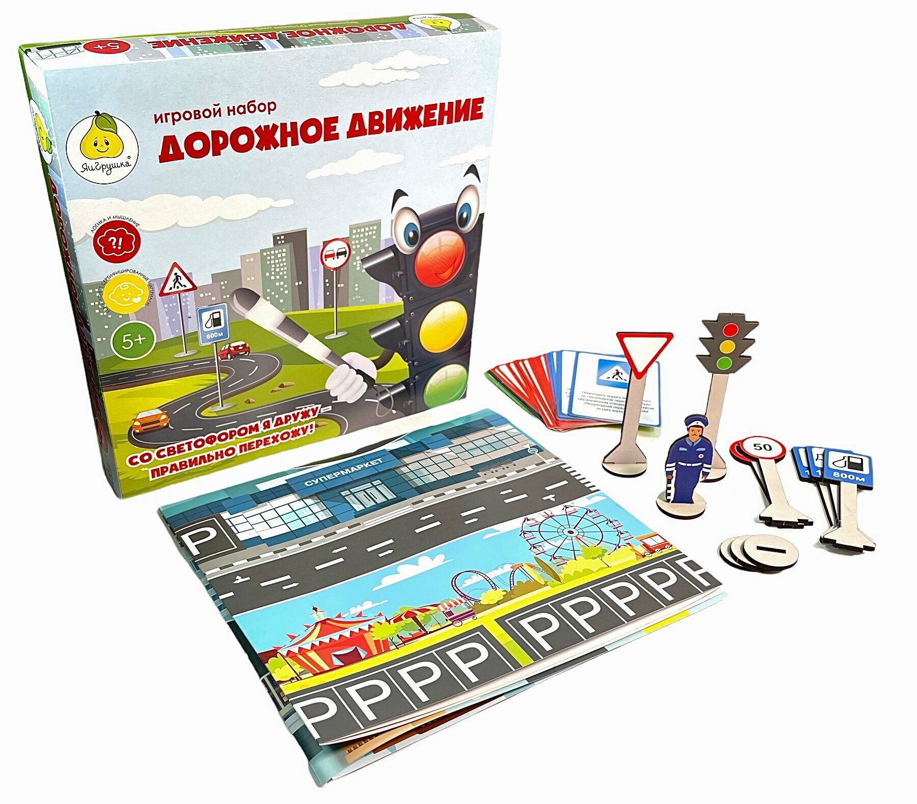 В наборе: 30 карточек (размер 6,6х9,6 см.), 30 дорожных знаков, 2 светофора, инспектор ГИБДД, игровое поле (размер 710х460 мм.).