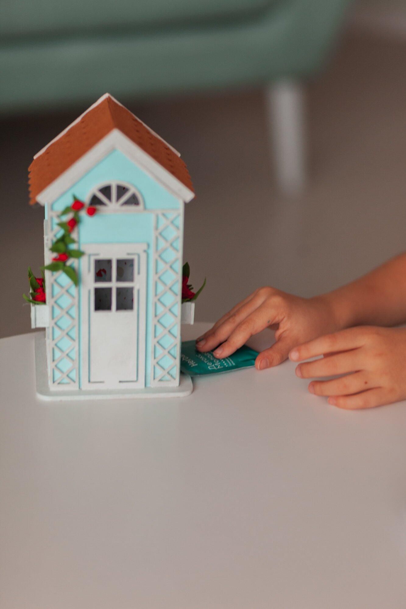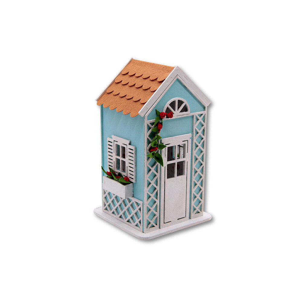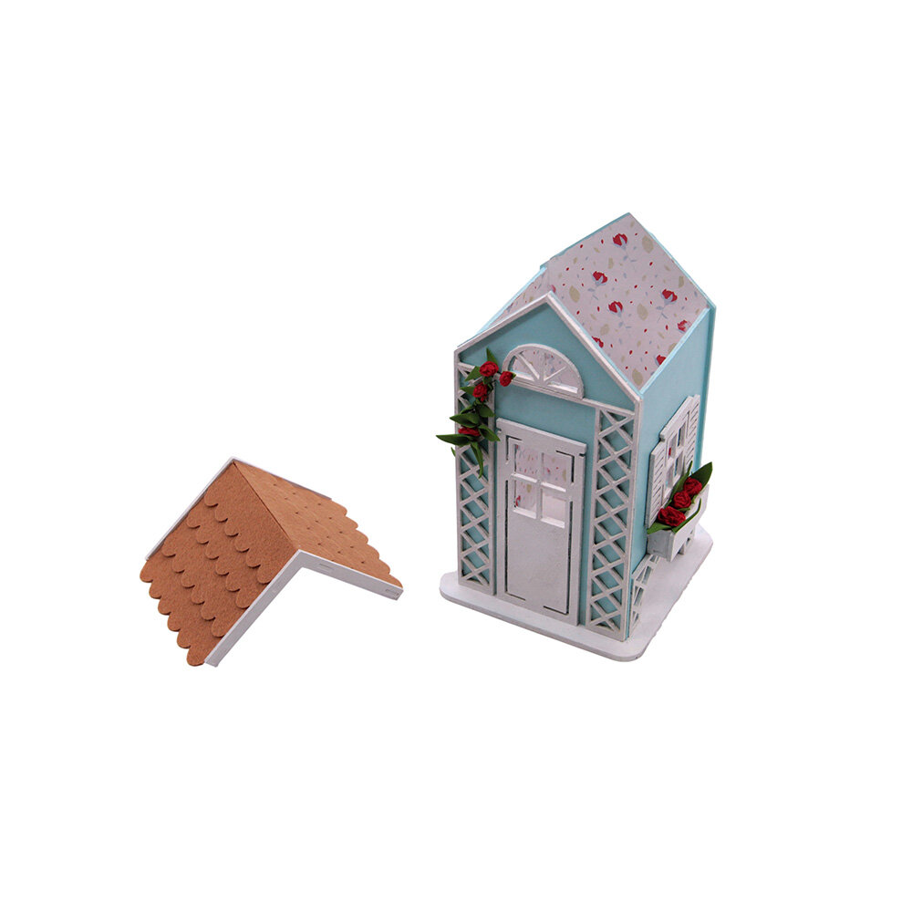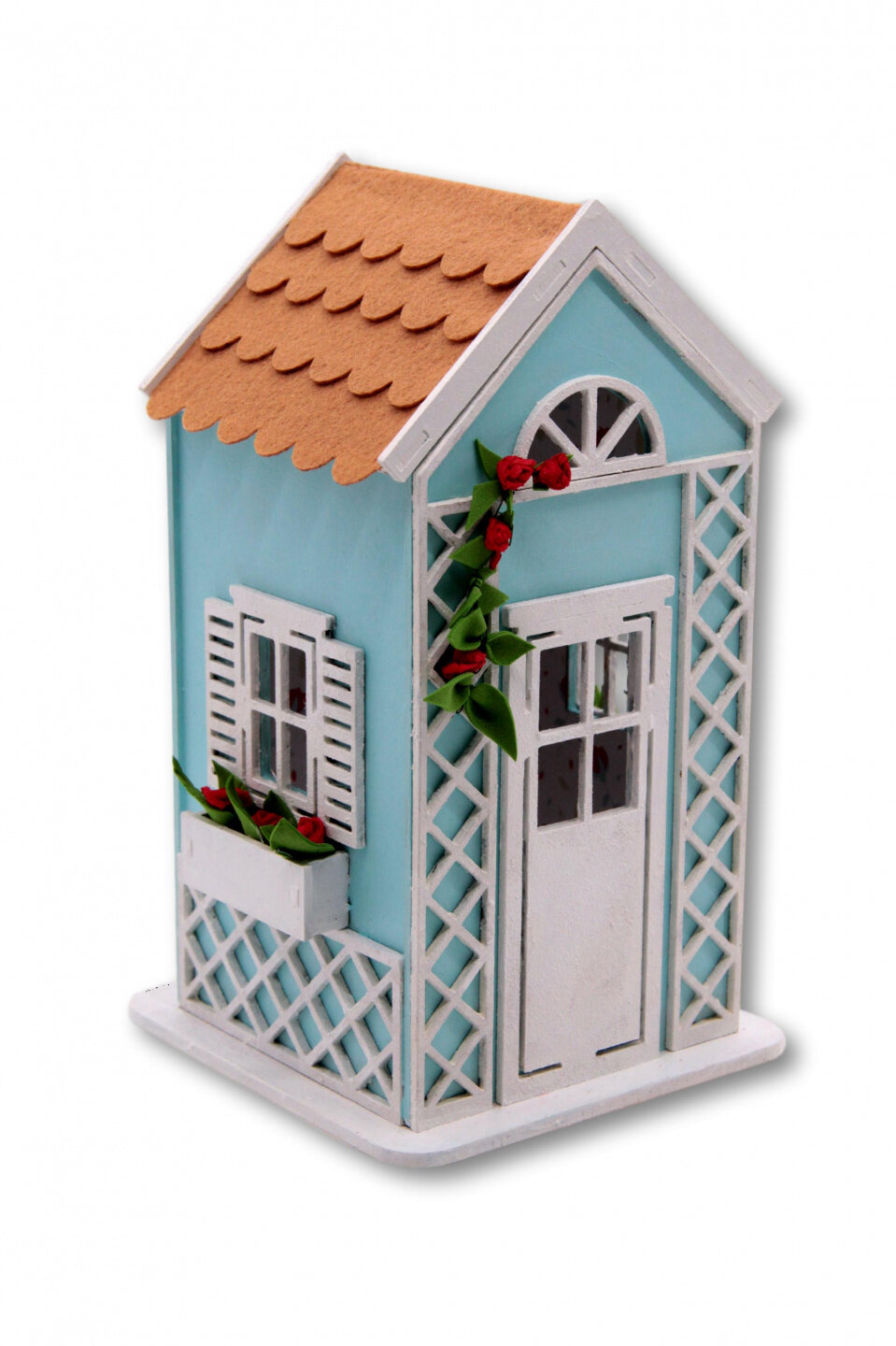 Заготовки домика сделаны из МДФ, которые без труда соединяются между собой. Части стен прокрашиваются краской с помощью губки. Внутренние стены домика оклеиваются дизайнерской бумагой. Крыша оформляется фетром. Добавляем декоративные детали из заготовок МДФ, фоамирана, креповой бумаги. Все заготовки вырезаны, ножницы в процессе работы не понадобятся. Для большей прочности в местах соединения рекомендуем использовать клей-пистолет.