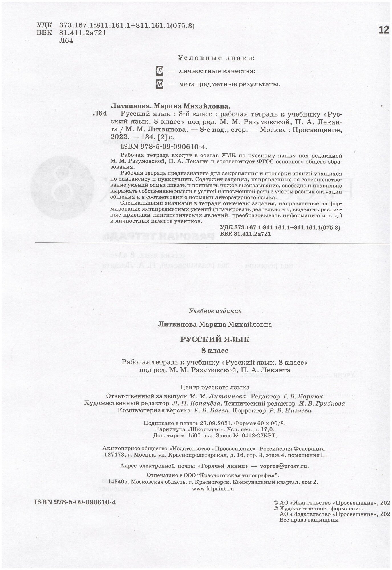 Русский язык 8 класс Рабочая тетрадь к учебнику Русский язык 8 класс под редакцией М М Разумовской П А Леканта (Марина Михайловна Литвинова); Просвещение, 2024