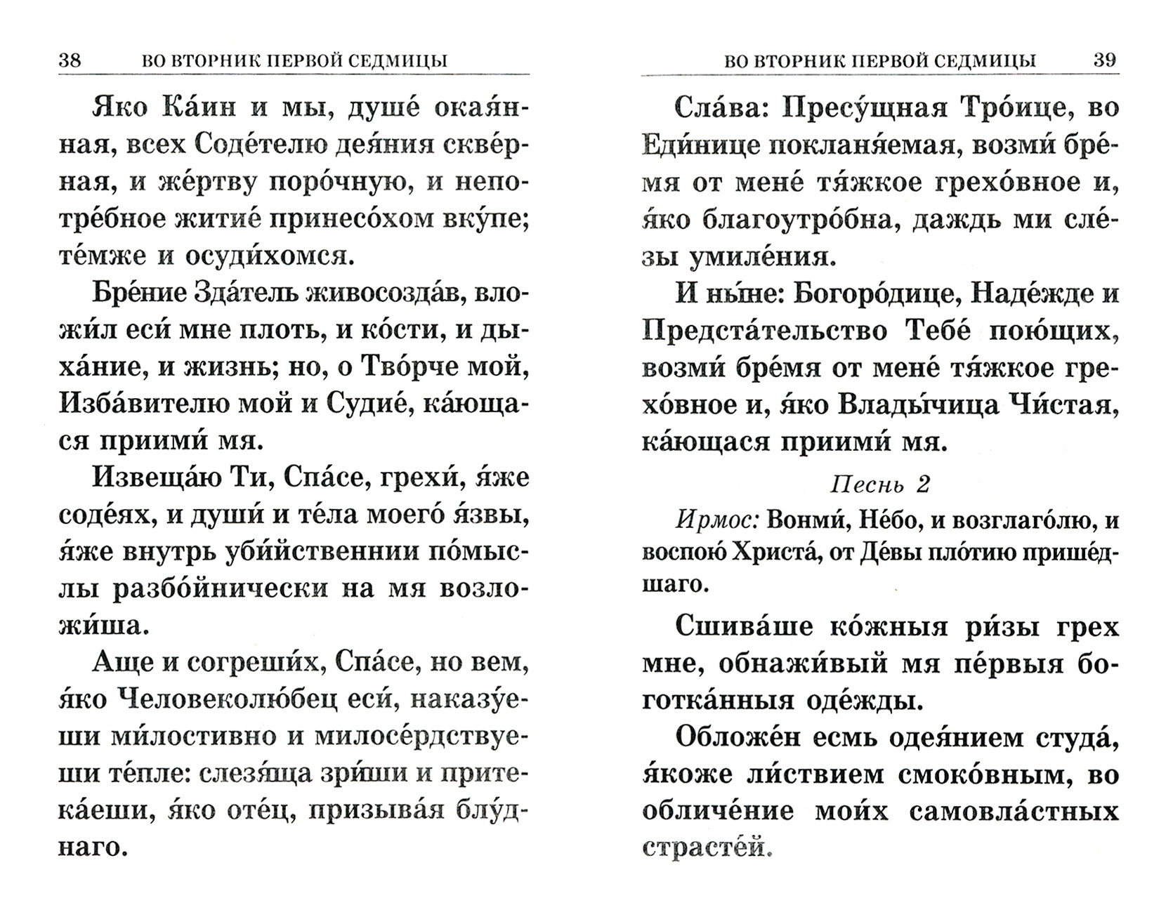 Книга включает в себя богослужебные тексты, необходимые православному христианину в течение Великого поста: Великий покаянный канон Андрея Критского, читаемый в первые четыре дня поста; затем весь текст канона, как он читается в четверг пятой недели Великого поста, на службе, именуемой "Стояние Марии Египетской"