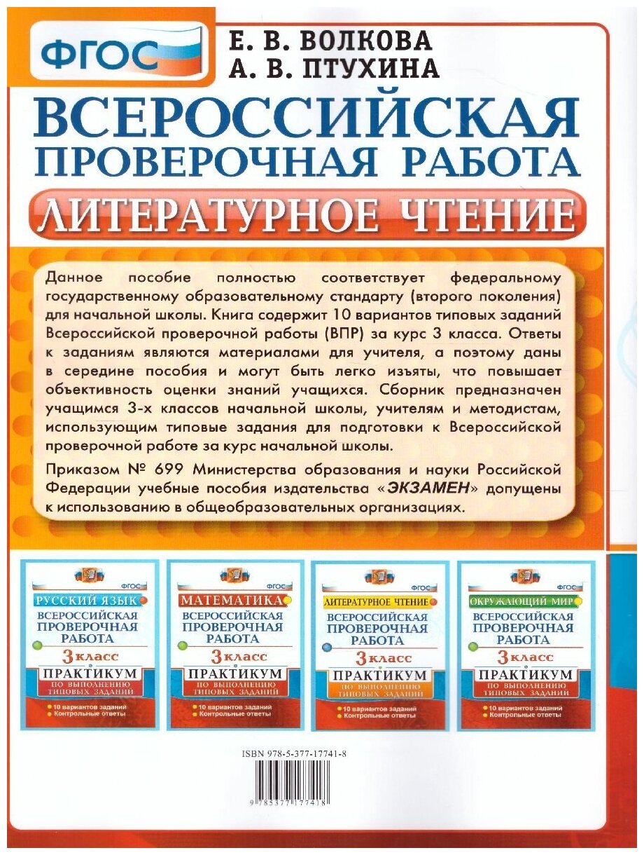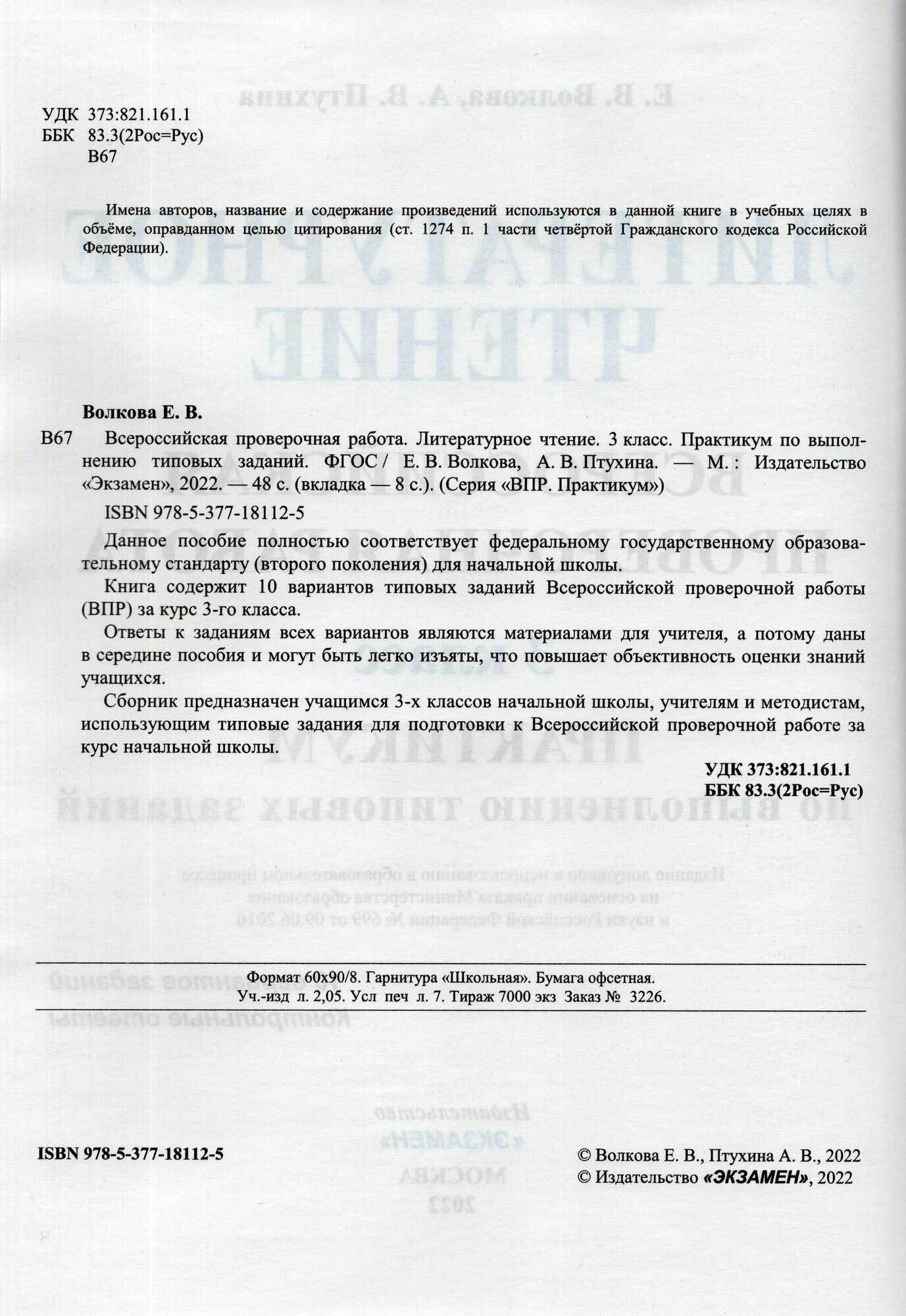 Всероссийская проверочная работа Литературное чтение 3 класс Практикум по выполнению типовых заданий (Волкова Елена Валерьевна; Птухина Александра Викторовна); Экзамен, 2022