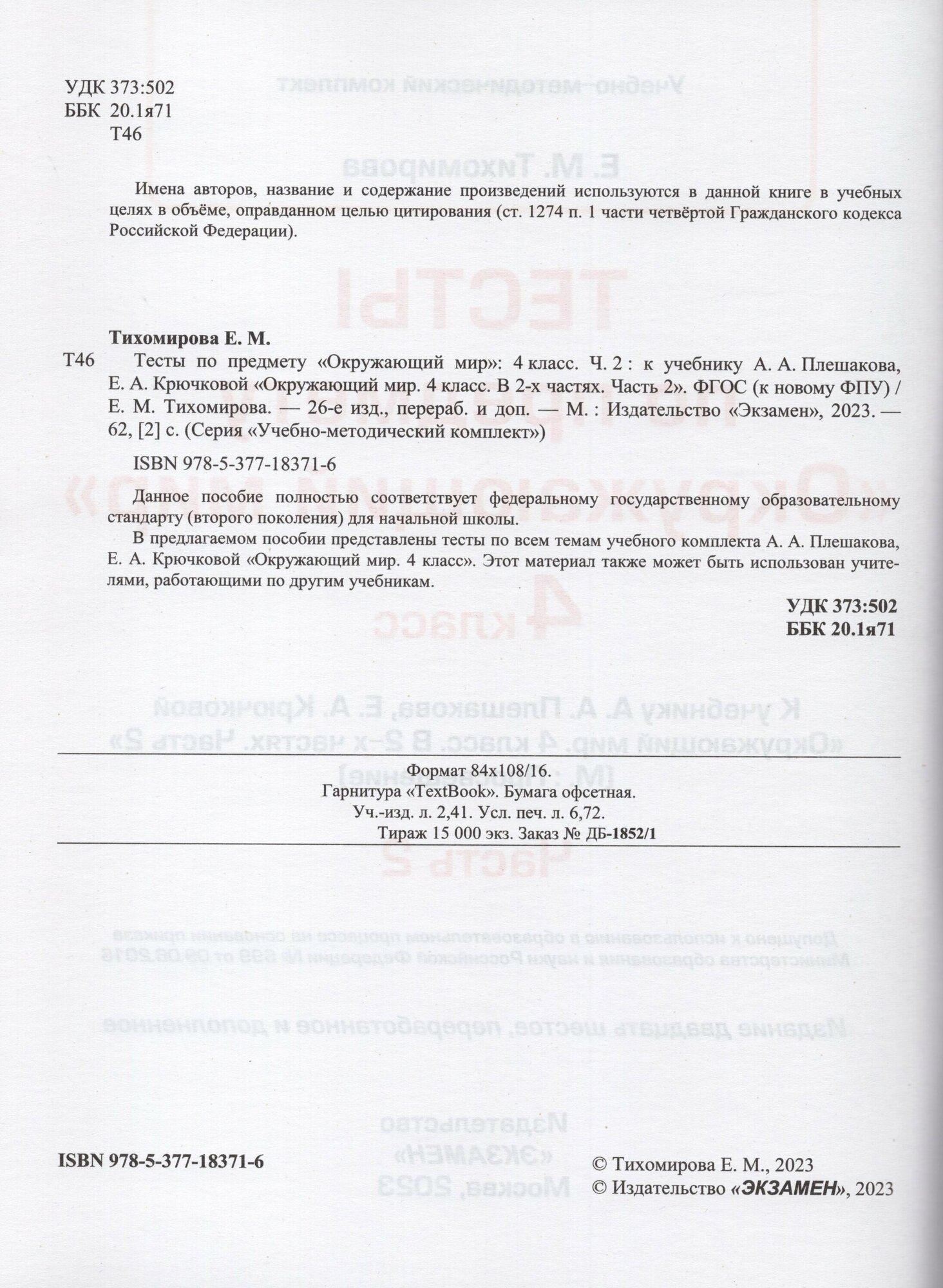 ТЕСТЫ ПО ПРЕДМЕТУ ОКРУЖАЮЩИЙ МИР. 4 КЛАСС. Ч. 2. К учебнику А. А. Плешакова Е. А. Крючковой Окружающий мир. 4 класс. В 2-х частях. Часть 2. Издание д (Елена Михайловна Тихомирова); Экзамен, 2025