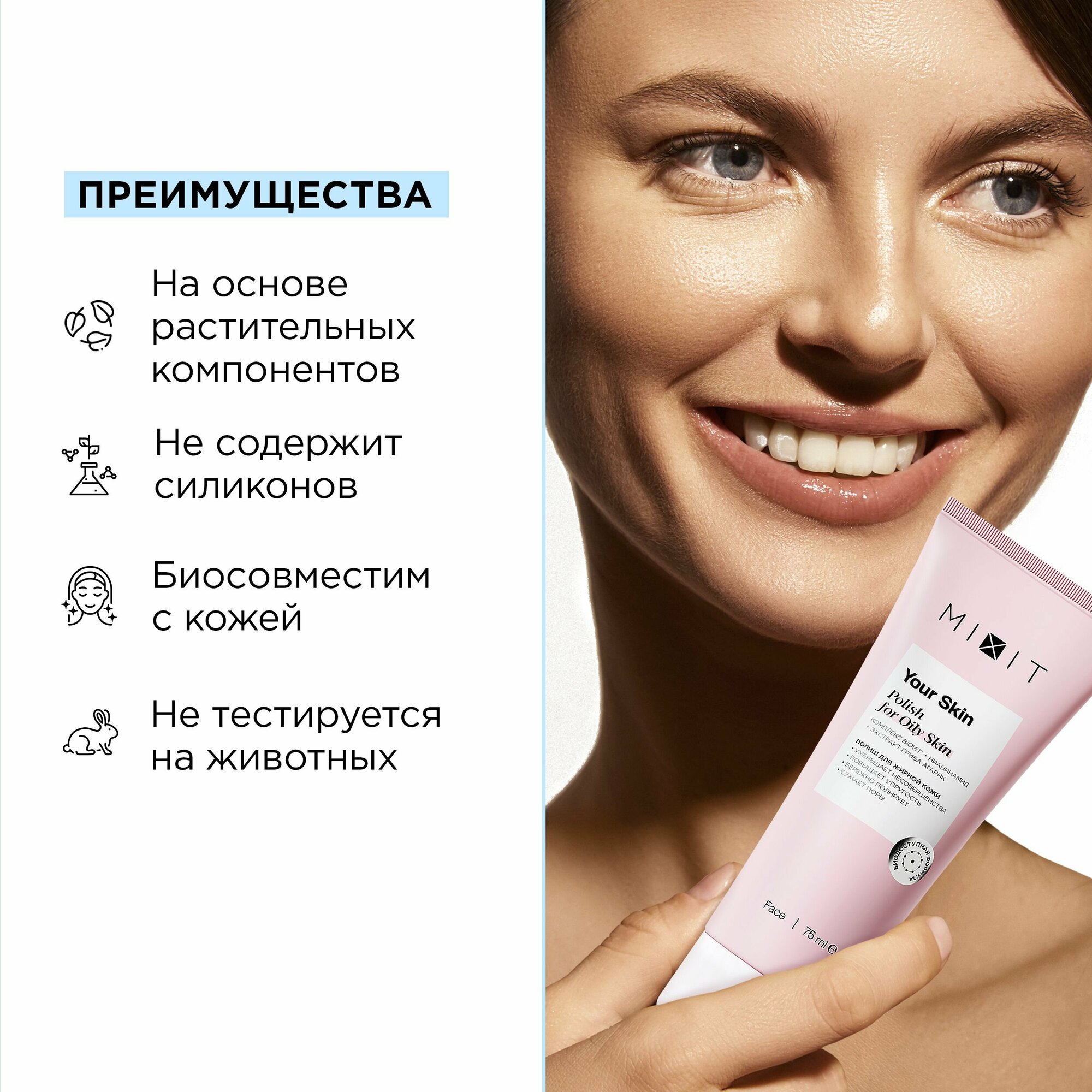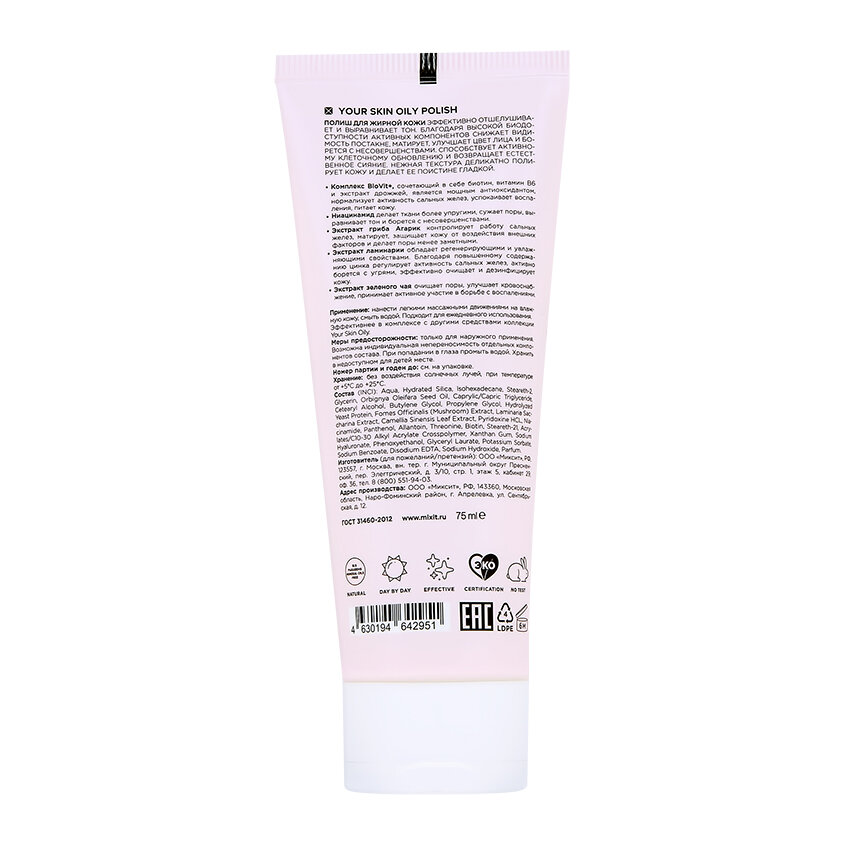 Полиш Mixit Your Skin очищает, отшелушивает и выравнивает микрорельеф. Защищает от негативных воздействий окружающей среды. Нормализует гидролипидный баланс. Сквалан и масло риса в составе — повышают эластичность и упругость. Пантенол увлажняет, способствует регенерации тканей и восстанавливает структуру. Экстракты черники и ежевики насыщают витаминами и полезными микроэлементами. Кремовая, нежная текстура с мягкими полирующими частицами делает поверхность лица гладкой и обновленной, не вызывает раздражений. Подходит для нормальной и сухой кожи.Способ применения: массажными движениями нанести немного средства на чистую влажную кожу, смыть. Использовать 1–2 раза в неделю для достижения наилучшего результата.