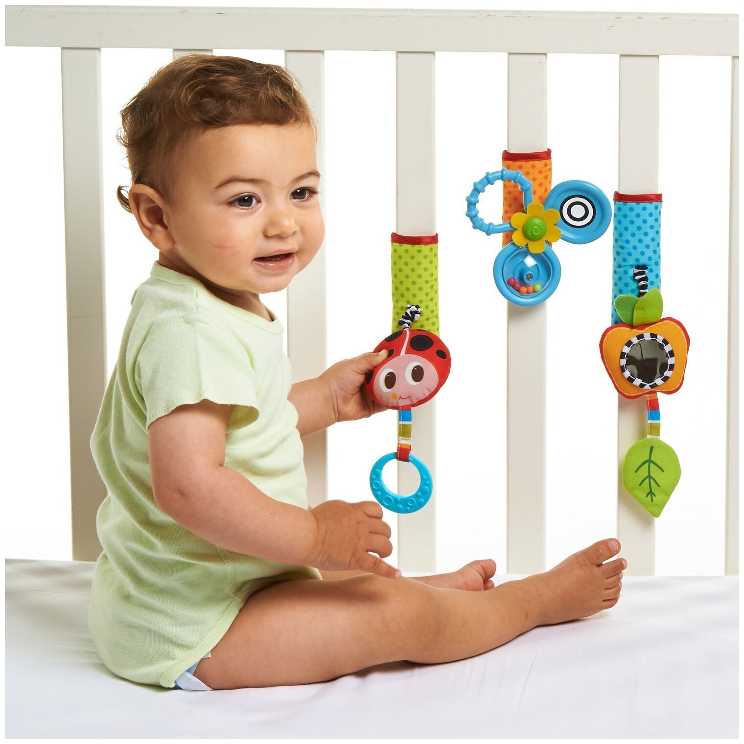 Tiny Love Подвесная игрушка Летняя полянка Комплект развивающих игрушек для колясок и детских манежей. Вместо одной игрушки покупатель получаете сразу 3. Можно разместить их на одном уровне или прикрепите в разных сторон кроватки, что малыш постоянно двигался и развивал мышечный тонус и крупную моторику. Широкая липучка делает игрушки универсальными и позволяет прикрепить их даже к самым широким бамперам колясок и перекладинам.