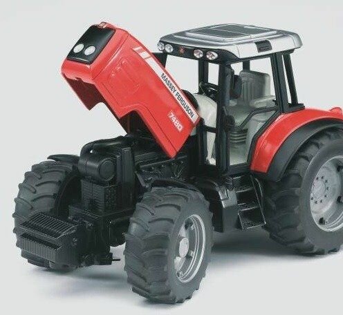Трактор с прицепом-самосвалом Massey Ferguson 7480 изготовлен из нетоксичного материала. Модель оснащена колесами, которые управляются дополнительным рулем. Передняя ось трактора имеет амортизатор, а кузов прицепа-самосвала может опрокидываться и фиксироваться в определенных положениях. Задний бортик прицепа-самосвала открывается, он может быть установлен на опору для придания дополнительной устойчивости положению конструкции тягово-сцепного устройства.