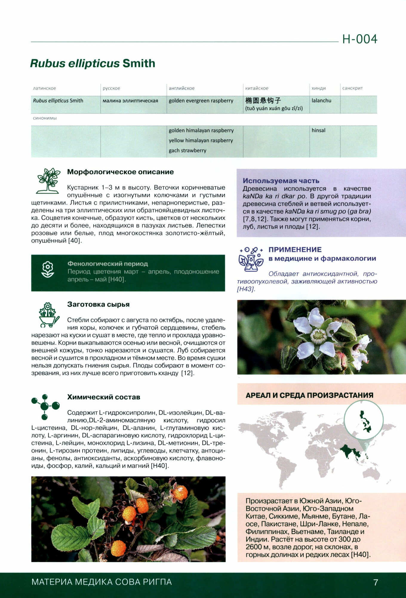 Также приводится полная достоверная научная информация обо всех наименованиях используемого сырья. Для растений это: латинские названия, синонимы, ареал произрастания, химический состав, применение в медицине, ботаническая информация.