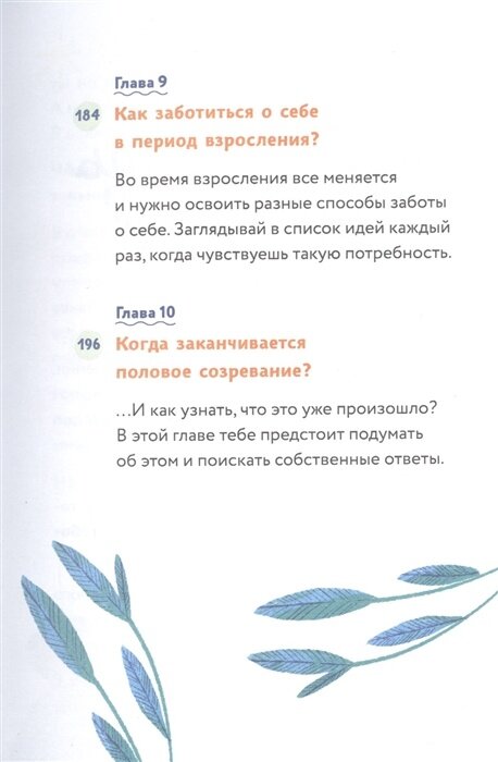 Во-вторых, содержание. Информации много, только треть книги про физические изменения, остальное – про эмоциональную сферу, правильное отношение к своему телу, уход. Причём начинается рассказ именно с эмоциональной стороны взросления. Это очень правильно, я считаю.