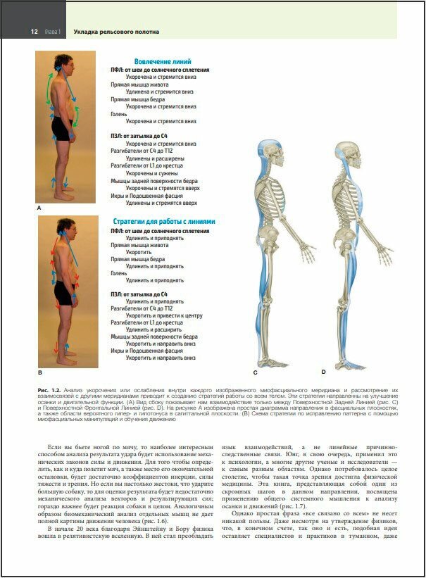 Т. Майерс предлагает революционный подход к изучению миофасциальной анатомии человека, разработав целую карту меридианов, то есть непрерывных линий в теле человека, ориентируясь на которую, можно определить истинный источник боли. В книге предложены методы оценки осанки ("чтение тела"), подробно описаны неправильные паттерны движения, встречающиеся в практике терапевта, а также даны рекомендации по корректировке. Каждый раздел сопровождается большим объемом фотографий, многие из которых были сделаны специально для 4-го издания.