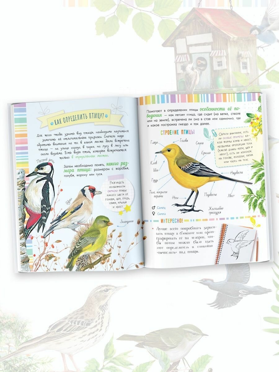 -  Анастасия- 19 октября 20225/5 Книга понравилась. Коротко о пернатых. Некоторых птах можно наблюдать в обычной жизни. Крупные и хорошо прорисованные иллюстрации, на которых видны отличительные особенности птиц (самочек, самцов, молодых птиц). Уделено небольшое внимание анатомии (на сколько это допустимо для 5-6 лет). Затронуты темы гнездования, особенности выведения потомства. Приведены примеры отличительных черт яиц разных птиц.