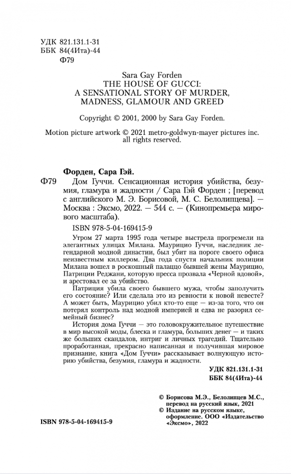 "Думаете, GUCCI - это всего лишь фирменные лоферы и логотип с буквой "G"? Эта захватывающая книга о модной империи и убийстве Маурицио Гуччи раскрывает жестокую правду о легендарной семье из мира высокой моды". - Glamour