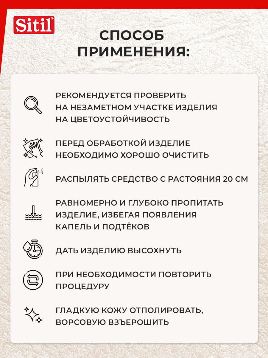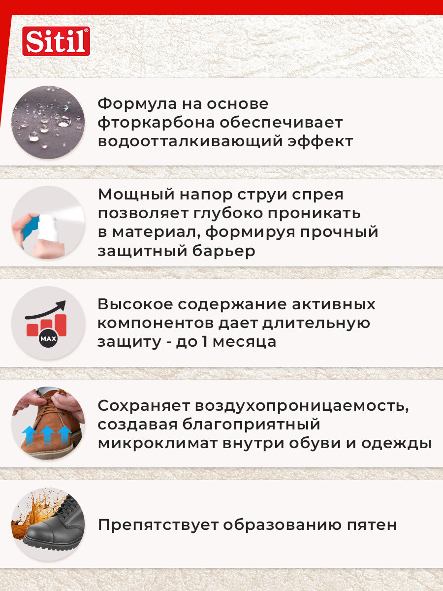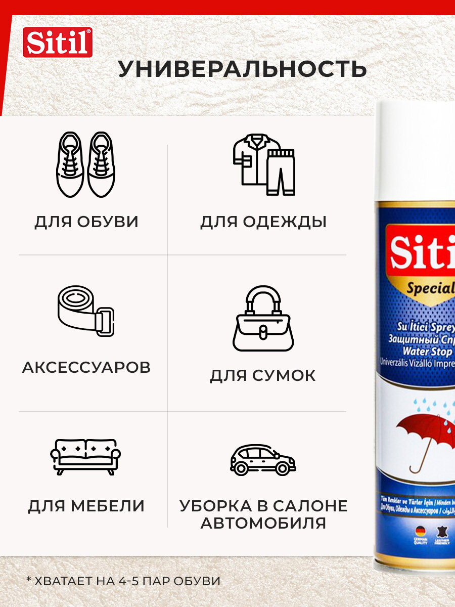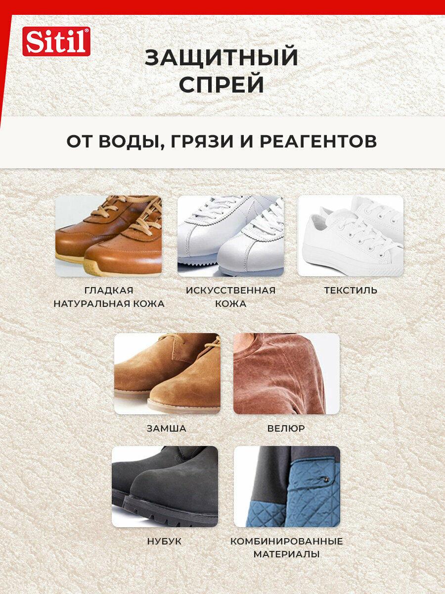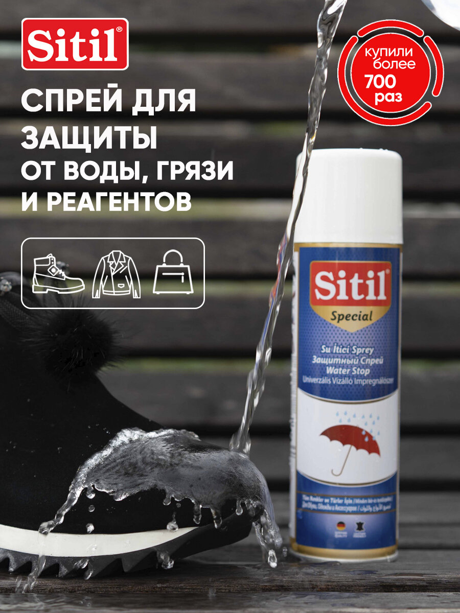 Универсальный, эффективный, бесцветный, защитный, водоотталкивающий спрей - пропитка для обуви Sitil Waterstop, подходит для всех видов кож (в т. ч. искусственных), текстиля и High-Tex материалов.Обувной спрей - защитное средство Sitil Waterstop действует длительное время, препятствует появлению солевых разводов от реагентов и пятен. Рекомендуется для защиты одежды и обуви из High-Tex материалов, мембран, в т. ч. Gore Tex, Sympatex и др. Сохраняет воздухопроницаемость материала. Объем 250 мл.Перед первым использованием изделие надлежит многократно обработать защитным спреем. Распылять спрей с расстояния 20-30 см на очищенную поверхность одежды или обуви, не допуская при этом появления капель и подтеков. Процедуру повторить через несколько минут после первого нанесения. Дать впитаться и просохнуть.