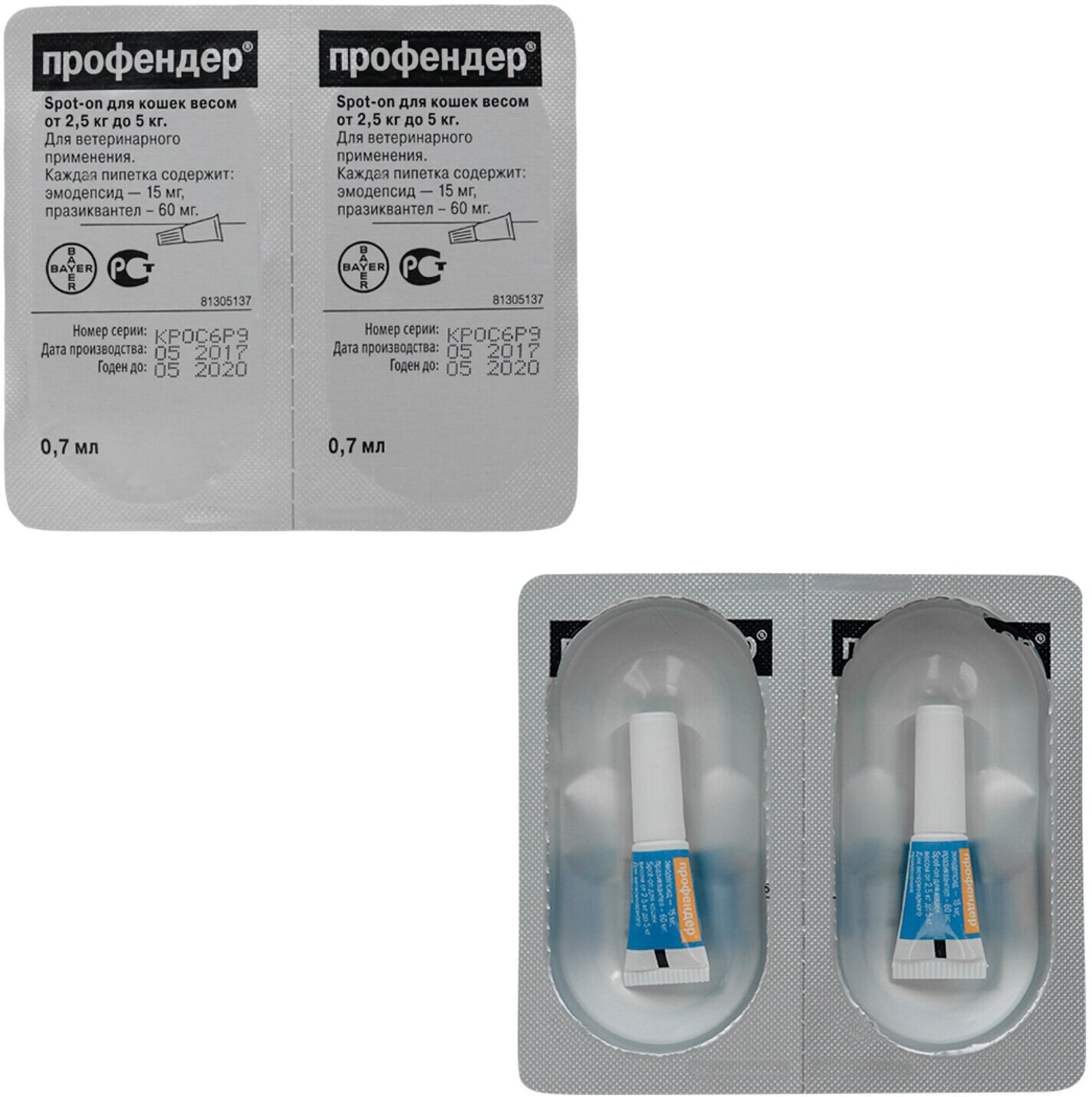 Капли на холку Профендер®- продукт, помогающий вам защитить кошку от внутренних паразитов - гельминтов. Капли Профендер® - новый взгляд на обработку кошек от гельминтов: комфортно избавляет от паразитов животное, препарат наносится на кожу в области основания шеи. Владельцы кошек отмечают удобство использования антигельминтного средства Профендер® в виде капель на холку*..Достоинства:u бладают широким спектром действия, т.е. работают против самых распространенных видов гельминтов (ленточных и круглых) и против редких, но опасных видов – гельминтов, поражающих легкие и бронхи кошек.u благодаря удобной пипетке капли легко наносятся холку, раздвинув шерсть. Обработка кошки без стресса для животного и для владельца.u действующие вещества проникают через кожу уже через 2 часа. После этого при необходимости можно помыть обработанное место.u регулярная обработка профилактирует появление гельминтов у кошки, что снижает риск заражения членов семьи. Рекомендуемая кратность обработки – 1 раз в 3 месяца. Не забывайте, что даже у домашних кошек, не гуляющих на улице, могут быть гельминты.Характеристика:u капли на холку от гельминтов для котят и кошекu действуют на ленточных и круглых гельминтовu действуют на взрослых паразитов в кишечнике и на мигрирующие по кровотоку личиночные стадииu разрешены котятам весом от 2,5 до 5 кгu разрешены котятам с 8 недельного возрастаu разрешены для всех пород кошекu срок годности 3 годаu производитель Elanco, Германия