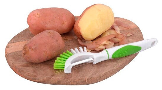 Овощечистка — кухонный инструмент для очистки овощей, фруктов, корнеплодов. Вертикальная овощечистка идеально подойдет для овощей продолговатой формы: моркови, огурцов, кабачков и т. п. Лезвие подходит для кожуры любой толщины, безопасно снимает ее ровным слоем, минимизируя пищевые отходы. Благодаря имеющейся щеточке, вы сможете удалить загрязнения с овощей и фруктов перед чисткой. Удобная ручка изделия обеспечивает дополнительный комфорт во время использования. Для удобства в хранении в ручке предусмотрено отверстие. Перед первым использованием и после каждого применения, вымыть в теплой воде, можно с жидким моющим средством, сполоснуть проточной водой и просушить. Можно мыть в посудомоечной машине. Изготовлено: корпус и щетина из пластмассы (полипропилен, TPR), лезвие из коррозионностойкой (нержавеющей) стали. Общая длина 21см.Цвет в ассортименте.