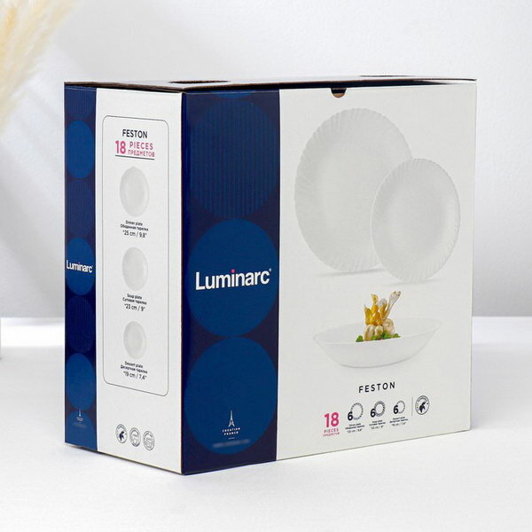 18 предметов: тарелка обеденная 250 мм- 6 шт.; тарелка суповая 230 мм - 6 шт.; тарелка десертная 190 мм - 6 шт.