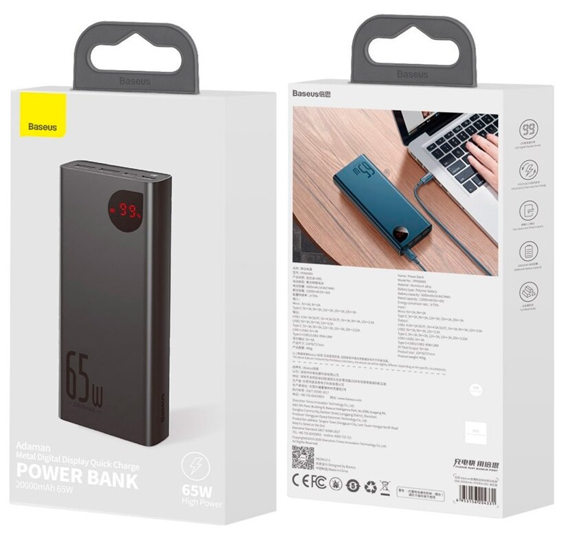 Внешний аккумулятор Baseus Adaman Metal Digital Display зарядит ваш смартфон до 50 % за 30 минут и сам заряжается в разы быстрее, благодаря поддержке стандартов быстрой зарядки: Quick Charge 3.0. В его элегантном корпусе из металла сосредоточена внушительная емкость на 4-5 зарядок смартфона. Благодаря наличию трех входных разъемов разного типа для его зарядки можно использовать кабель с коннектором micro-USB, USB Type-C или Lightning. Информация о текущем выходном напряжение, силе тока и уровне оставшегося заряда в процентах отображается на небольшом LED-дисплее.