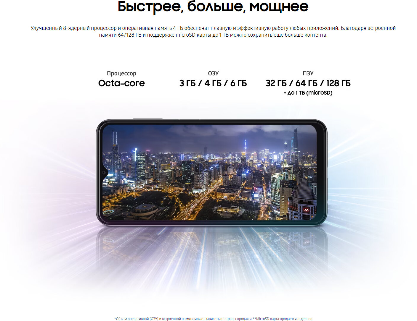 Благодаря 6.6-дюймовому экрану Infinity-V на смартфоне Samsung Galaxy A13 вы сможете увидеть всё, что было скрыто от вашего взгляда. Наслаждайтесь живым четким изображением с технологией FHD+. Galaxy A13 сочетает деликатные цвета и приятную на ощупь текстуру. Благодаря изящным изгибам его удобно держать при работе с экраном. Запечатлейте ценные моменты во всех деталях с основной камерой 50 Мп. Расширьте угол обзора с ультраширокоугольной камерой. Камера с датчиком глубины поможет настроить фокус, а макрообъектив — снять всё до мельчайших деталей. Подобно человеческому глазу, ультраширокоугольная камера 5 Мп обеспечивает угол обзора 123 градуса, придавая вашим снимкам более глубокую перспективу. Будьте на шаг впереди с надежным аккумулятором. Делайте что угодно, не беспокоясь о заряде, с аккумулятором 5000 мАч