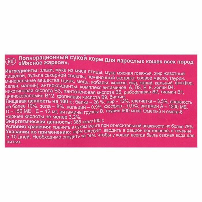 Ингредиенты: злаки, мука из мяса птицы, мука мясная говяжья, куриный жир очищенный, дрожжи, печеночный экстракт, минеральные вещества, антиоксиданты, витамины А, Д3, Е, холин В4, рибофлавин В2, тиамин В1, пантотеновая кислота В5, никотиновая кислота В3, пиридоксин В6, биотин, цианокобаломин В12, таурин.Рекомендуемое количество сухого корма в день(вес взрослого животного - суточная норма):2-3 кг - 50-70 гр.4-5 кг - 80-100 гр.6-7 кг - 110-140 гр.8-10 кг - 150-170 гр.Количество корма в день может изменяться в зависимости от времени года, физической активности и индивидуальных особенностей животного.Пищевая ценность на 100 г. корма:белки – 26 %жир – 12%клетчатка – 7 %влажность не более 10%зола – 5%кальций – 0,9 %фосфор – 0,9 %витамин А – 1200 МЕД3 – 150 МЕЕ – 12 мгвитамины группы Втаурин 1050 мг/кгЭнергетическая ценность: 365 ккал/100 г.Условия хранения: хранить в сухом месте при относительной влажности воздуха 75%. Срок годности 15 месяцев с даты изготовления.Указания по применению: корм следуем вводить в рацион постепенно, в течении 5-10 дней. Необходимо следить за тем, чтобы у кошки всегда была свежая вода для питья.