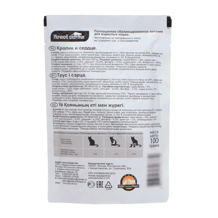 Изготовлено из натурального мяса, не содержит сои, консервантов и генномодифицированных продуктов."Ночной охотник" из серии "Суперпремиум" - нежные кусочки мяса в приятном желе. Содержит все необходимые для кошки питательные вещества, белки, минеральные вещества, витамины, таурин и другие компоненты, необходимые кошке для ежедневного сбалансированного питания. Состав: мясо и субпродукты животного происхождения (кролик не менее 10%, сердце не менее 10%), растительное масло, злаки, минеральные вещества. Содержит все необходимые витамины: А, D3, Е (tocopherol), таурин. Энергетическая ценность: 83 кКал/100г. Пищевая ценность (100 г): Кальций – 0,25%Фосфор - 0,3%Массовая доля влаги – 80%Сырая зола – 2%Сырой белок – 7%Сырой жир – 3,5%Сырая клетчатка – 0,4%Условия хранения: от +5С до +35С при относительной влажности не более 75%. Срок хранения 2 года. Употребить до даты указанной на упаковке. Рекомендации по кормлению: В среднем взрослой кошке весом 4-5 кг требуется приблизительно от 3 до 4 пакетов корма в день. Один пакет предназначен на одно кормление. Рекомендуемая порция только ориентировочная. Индивидуальная потребность Вашей кошки зависит от её веса, активности и возраста. Подавать корм комнатной температуры. Следите за тем, чтобы у кошки всегда была свежая вода.
