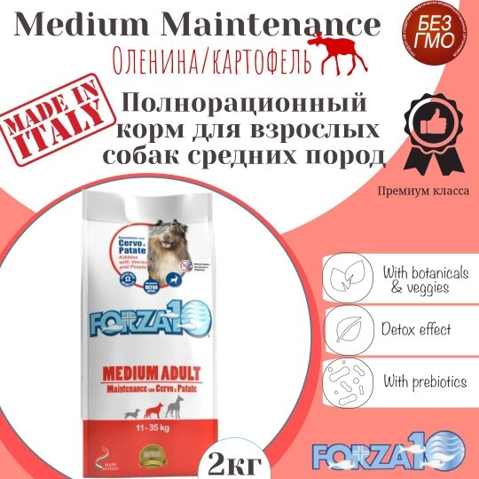 Forza10 MEDIUM ADULT MAINTENANCE c олениной и картофелем — полнорационный и сбалансированный корм супер-премиум класса для взрослых собак, пород средних размеров, разработанный Научно-Исследовательским отделом компании SANYpet.