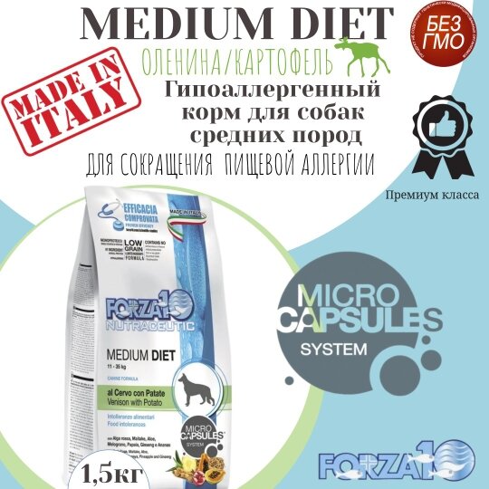 Forza10 MEDIUM DIET из оленины и картофеля – полнорационный, гипоаллергенный корм для собак аллергиков, продукт диетической линии компании SANYpet для всех пород, средних размеров, чувствительных к мясу интенсивного животноводства.