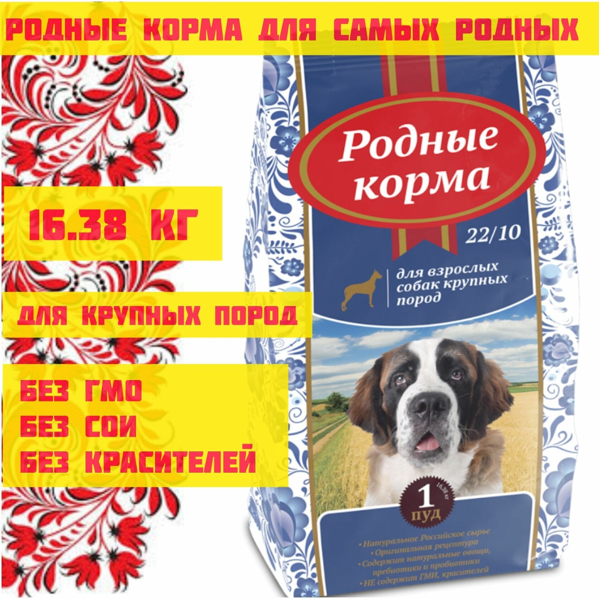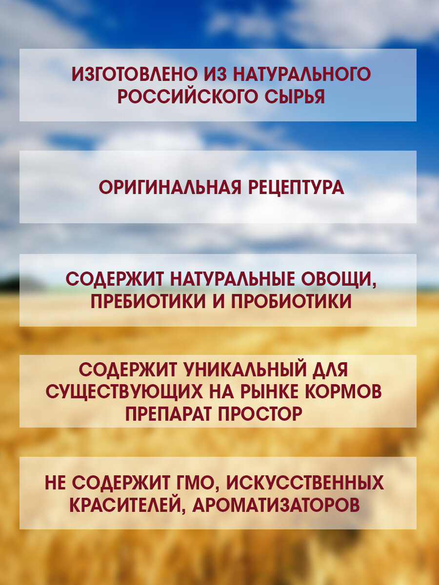 Для полноценной жизни собакам крупных пород требуется сбалансированное питание, которое будет включать в себя необходимые жиры, белки, углеводы, а также витамины и минеральные вещества. «Родные корма» для взрослых собак крупных пород — один из примеров высококачественных кормов для домашних питомцев.В производстве сухого корма для собак «Родные корма» используются только натуральные продукты, произведенные на территории нашей страны, а также оригинальная российская рецептура с массой полезных добавок (фрукты и овощи, а так же пребиотики и пробиотики), адаптированная специально под содержание собак в нашей стране, а лекарственные травы придают продукту особую биологическую ценность и обеспечивают высокую эффективность применения.В «Родные корма» для взрослых собак крупных пород входит уникальный для существующих на рынке кормов препарат ПроСтор. ПроСтор разработан совместно с Институтом экологии и эволюции им. А. Н. Северцова РАН.ПроСтор — кормовая синбиотическая добавки нового поколения, обеспечивающая биозащиту организма, повышение продуктивности животных за счет улучшения конверсии корма, стимуляции обменных и иммунных процессов организма.ПроСтор производится по уникальной биотехнологии; содержит иммобилизованные на фитосорбенте живые культуры и продукты их метаболизма — набор важнейших ферментов, а также другие биологически активные вещества.Благодаря тому, что живые клетки Bacillus защищены структурами пектиновых комплексов, они практически не подвержены негативному влиянию кислой среды желудка и высокой температуры при производстве гранул сухого корма.